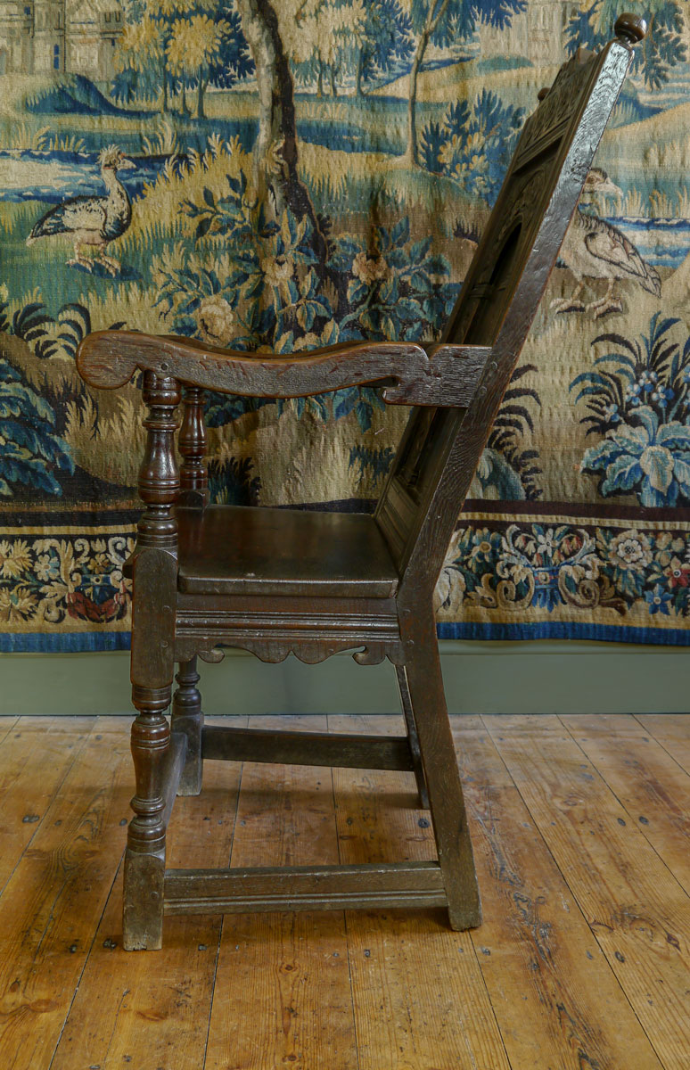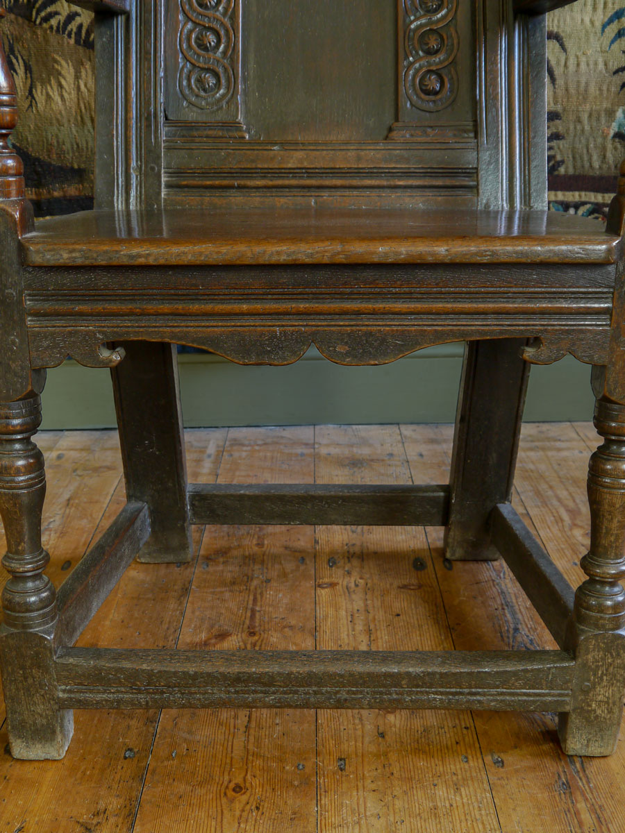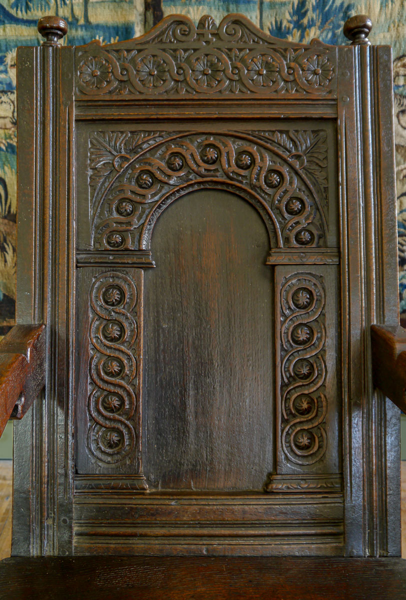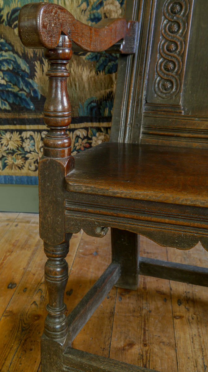 The panel back, with an arcaded arch supported on strapwork carved columns, below a simple scrolled cresting rail, flanked by the original turned finials. The original boarded seat is secured to the shaped seat rails by short oak pegs.