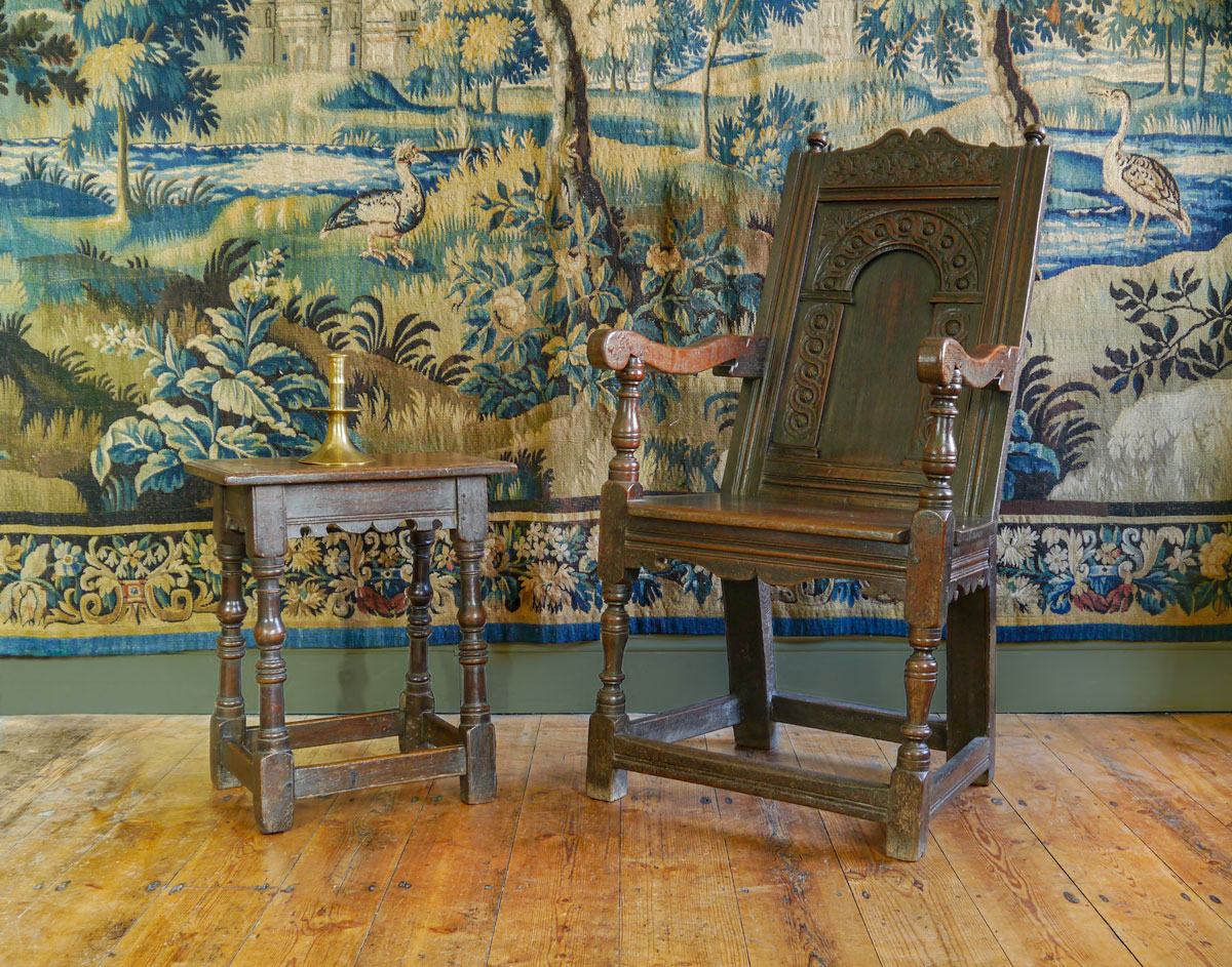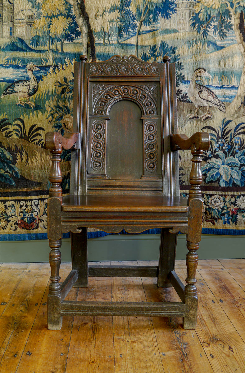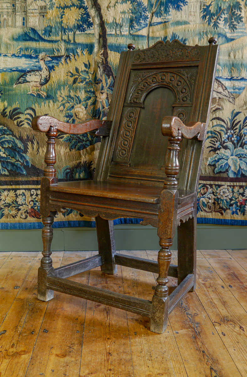 The panel back, with an arcaded arch supported on strapwork carved columns, below a simple scrolled cresting rail, flanked by the original turned finials. The original boarded seat is secured to the shaped seat rails by short oak pegs.
