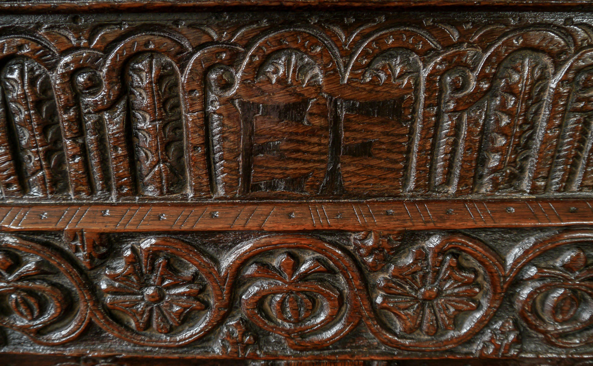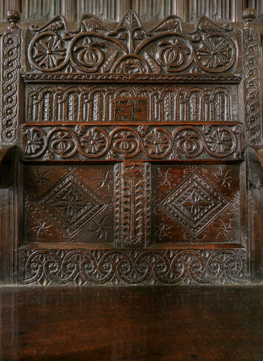 The horizontal upper panel is carved with a “run” of higher and lower arches, each filled with an upright stem, supporting leaves. The centre of the panel is inlaid with the owner’s initials “E E”, in holly.