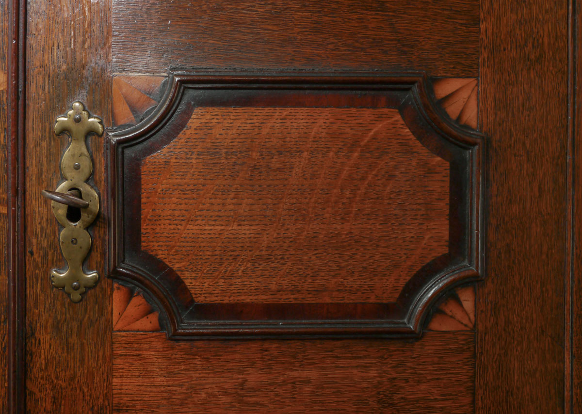 A most intricate piece of mid-18th century cabinet making. The joiner showed as many of his skills as possible in this standing corner cupboard. The break front cornice has a dental detail above a mahogany band. The arched upper doors, which again have mahogany banding and tiny quarter paterae inlays on each corner, open to reveal two scalloped shelves.