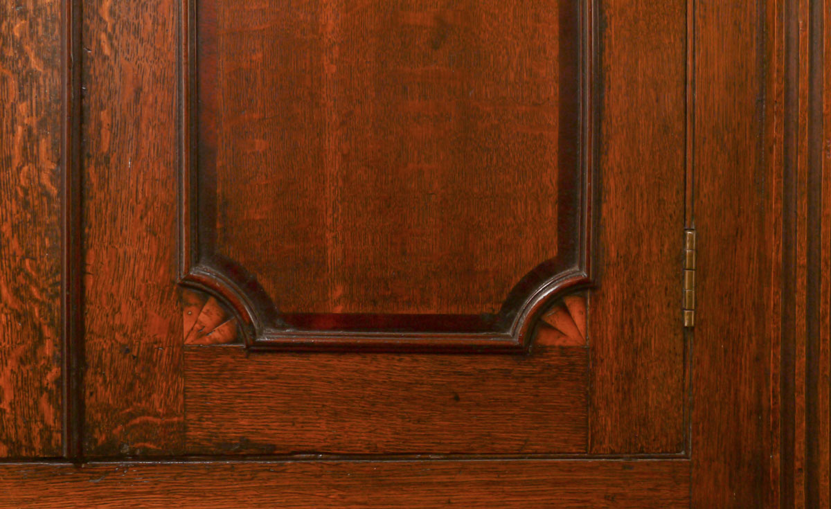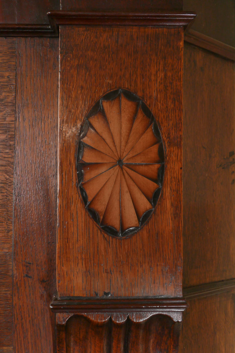 The waist moulding conceals a brushing slide, which sits above the bottom doors which open to reveal three oak drawers (a feature I have never seen before). Two long reeded columns to the outside of the doors are terminated at the top by outward-curved scrolls below lovely oval paterae.