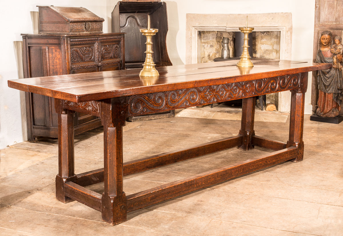The thick three plank top, supported on a substantial base of four deeply chamfered legs, joined at the top by an arabesque carved frieze, and at the bottom by heavy square stretchers, with a scratch run moulding on the top surface. Beautifully pegged throughout, with large oak dowels, the table is in an untouched condition and the most amazing rich colour and surface.