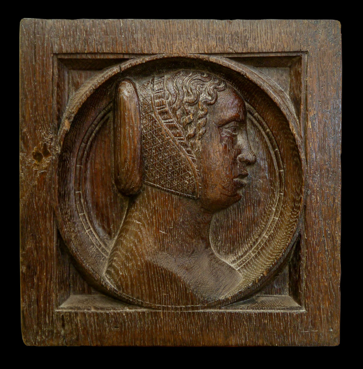 Each panel exceptionally deeply carved, the male head, possibly a crowned King, shown within a roundel. The female, again in a deep roundel, wears a close-fitting cap, or coif, is possibly a Queen.