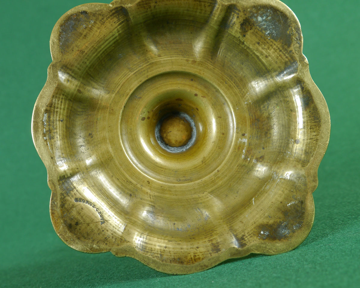 With brazing lines running from the sockets down through the stems. Interestingly, although a totally matching pair, one candlestick is stamped by the maker George Grove, whilst the other is stamped Joseph Wood. This would seem to indicate that both makers enjoyed a close working relationship. The combination of the two names has been traced on other pairs – see Eloy Koldeweij’s The English Candlestick, page 113, catalogue 87.