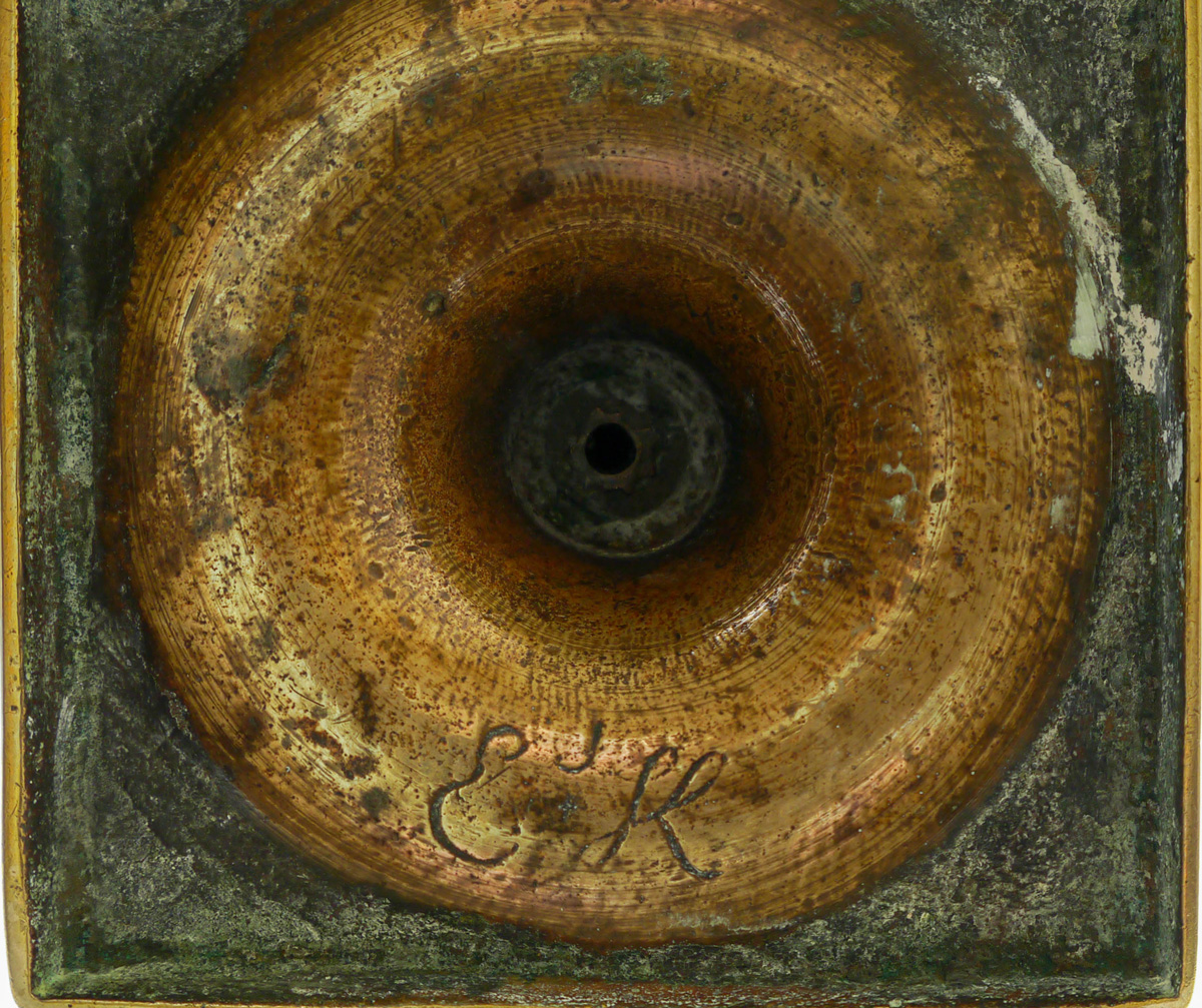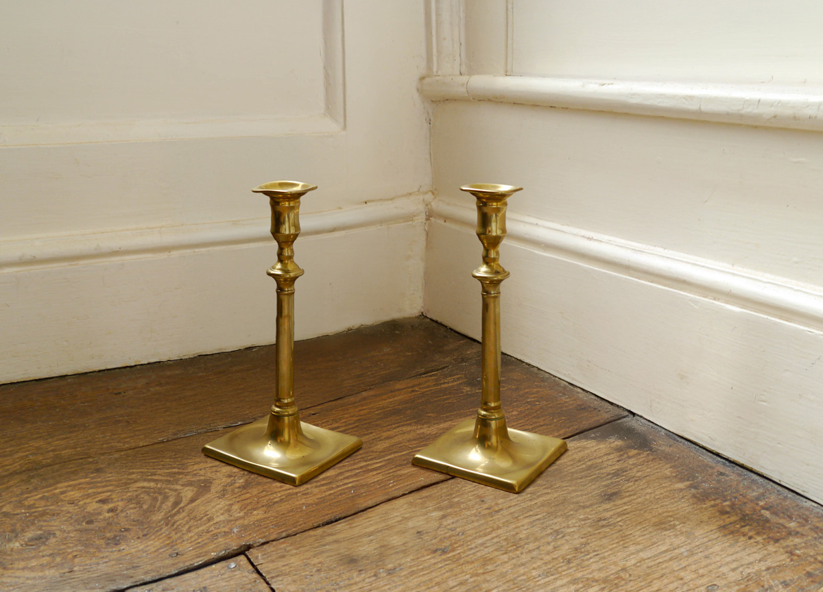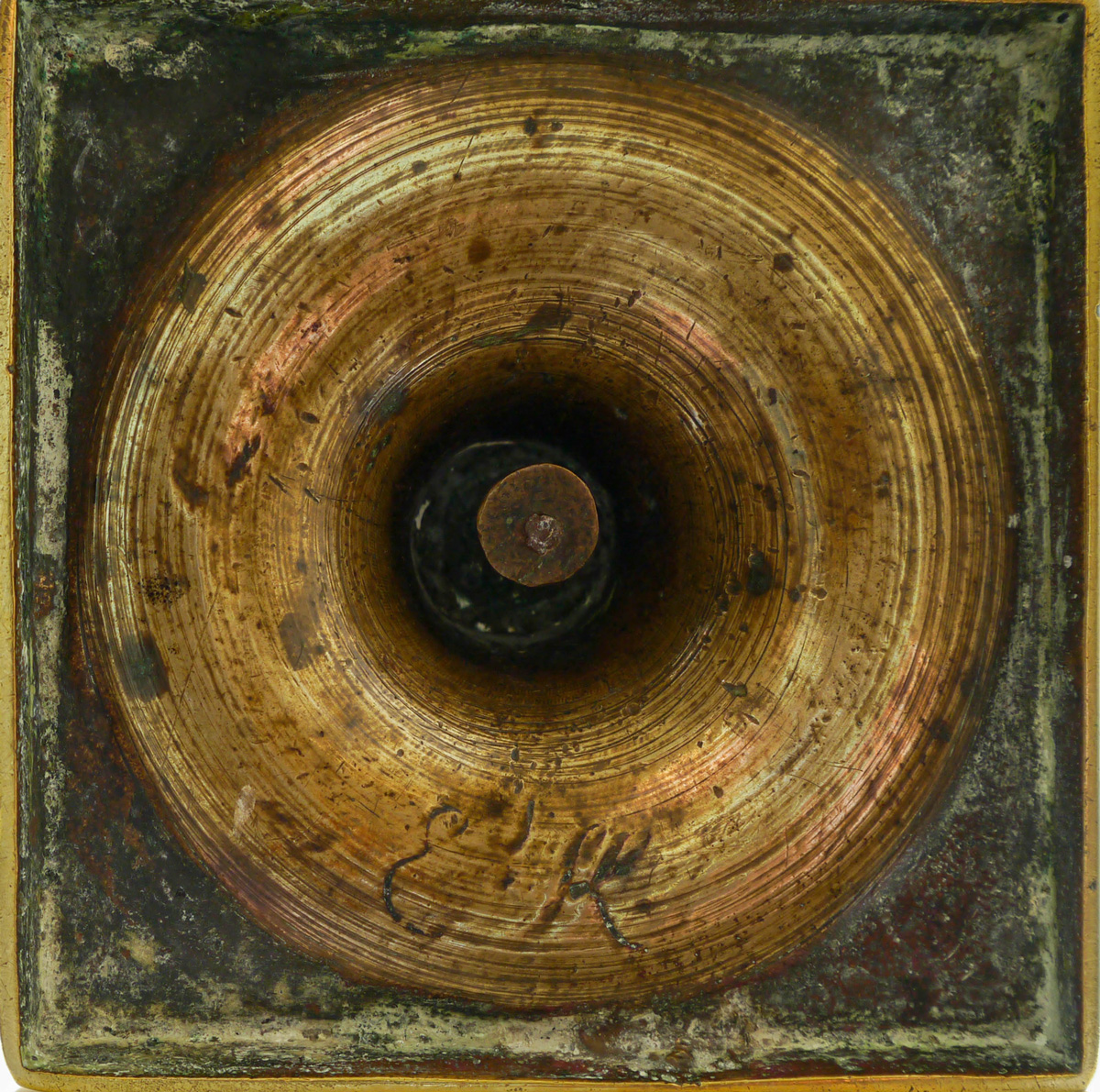 The square bobeche, matching the dished square base, with an elegant slightly tapering stem.