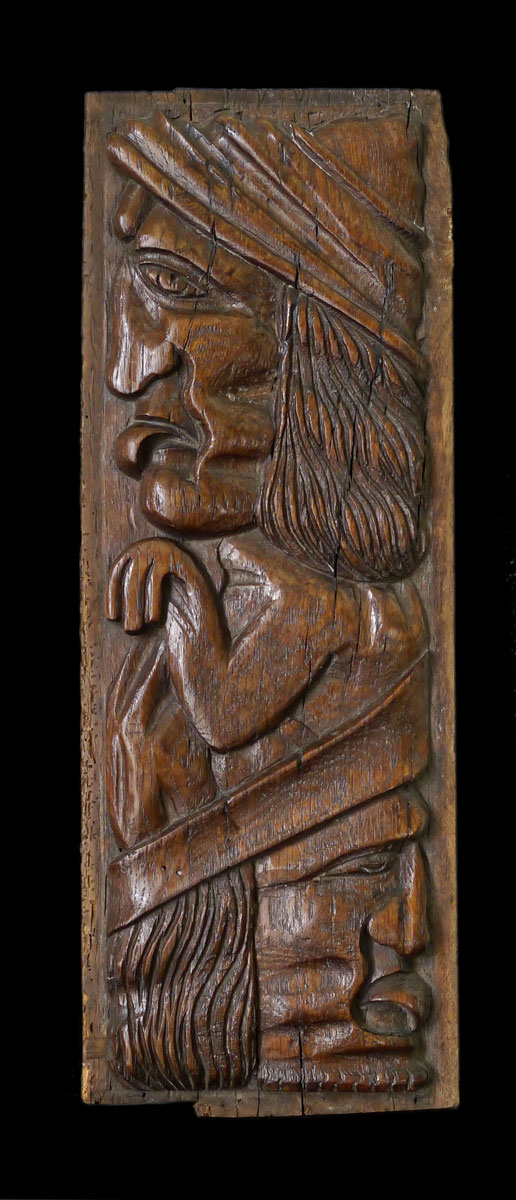 Probably forming part of a church’s panelling, these “warning symbols” served as a visual reminder to the congregation – who probably could not read – of the sins they may succumb to.