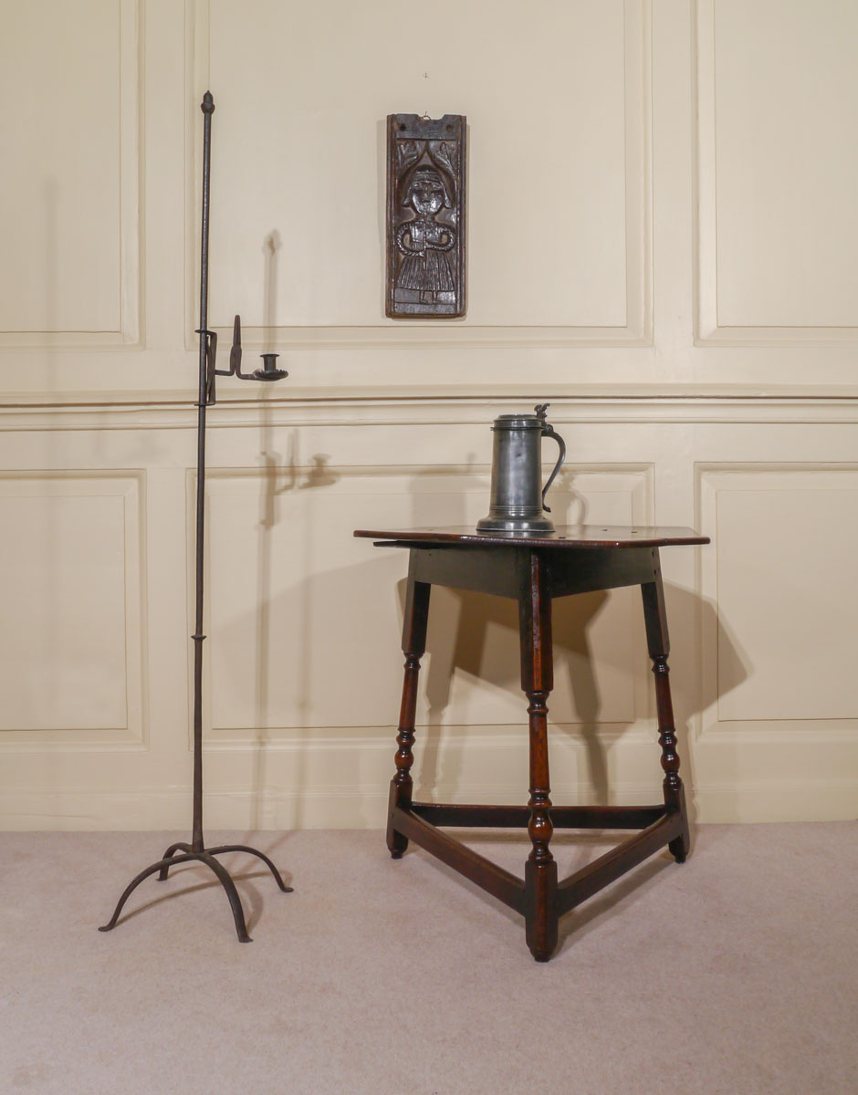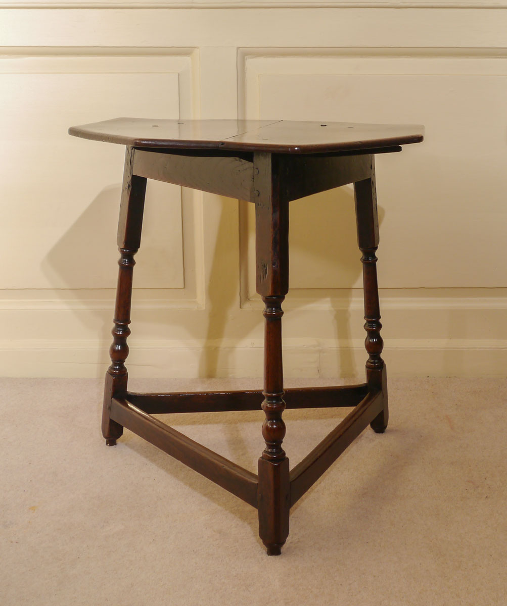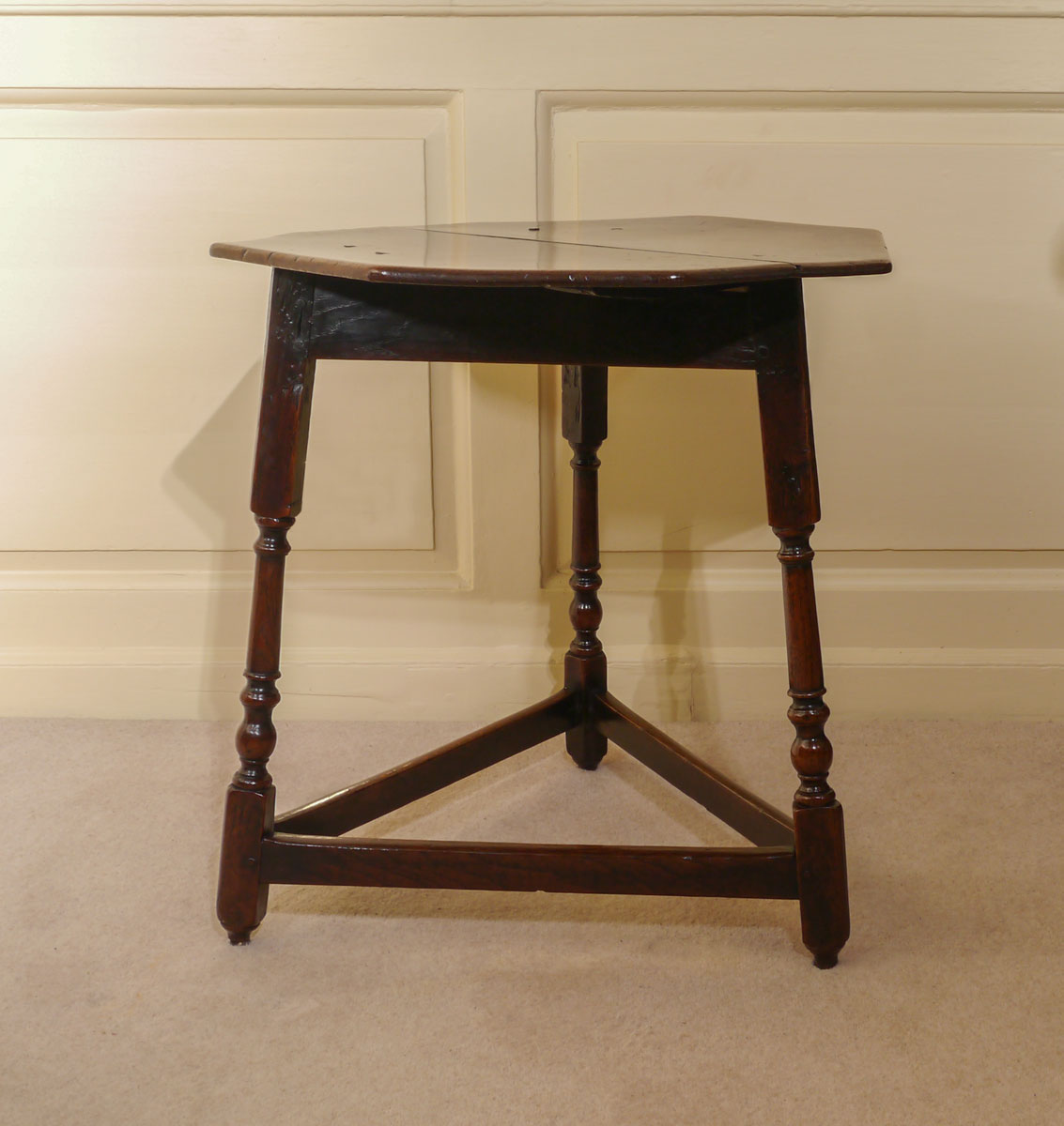 Having a most unusual octagonal two-plank top, secured to the underframe, with beautiful original square dowels. The well-turned baluster legs, joined by all-round stretchers, terminate in the original toes.