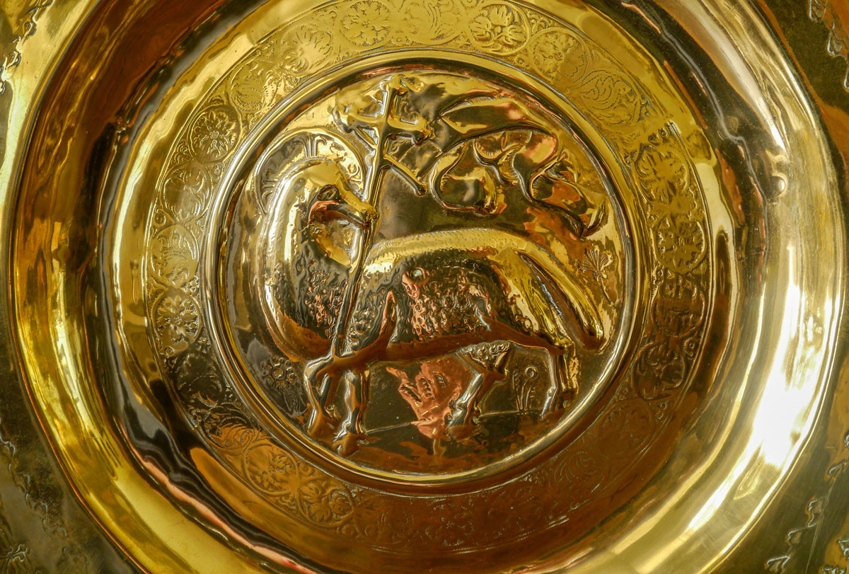 "Agnus Dei" (Lamb of God) is the central decoration, surrounded by a decorative band of stylised leaves and flowerheads. The plain boodge rises to a broad rim with stamped and punched decoration and a rolled edge.