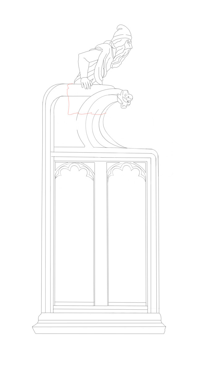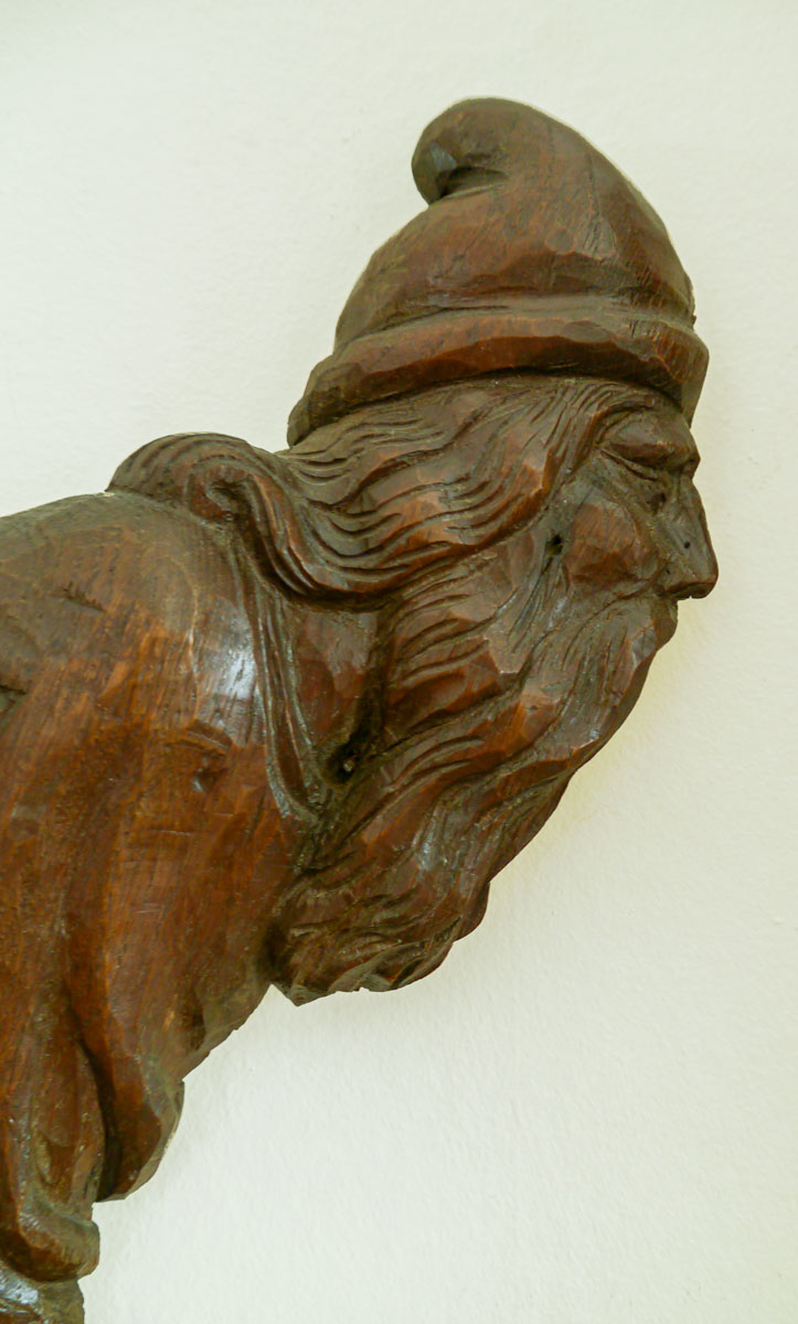 The figure is carved with a flat back, which would suggest the pew – or stall – was against the wall, and this would be the left hand side, if seated. For an example of how the figure might have appeared on the pew, see the diagram below.