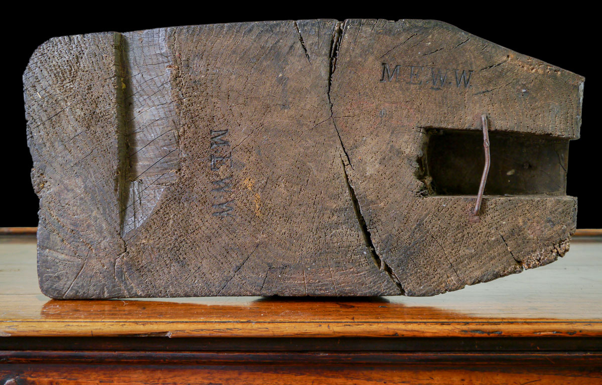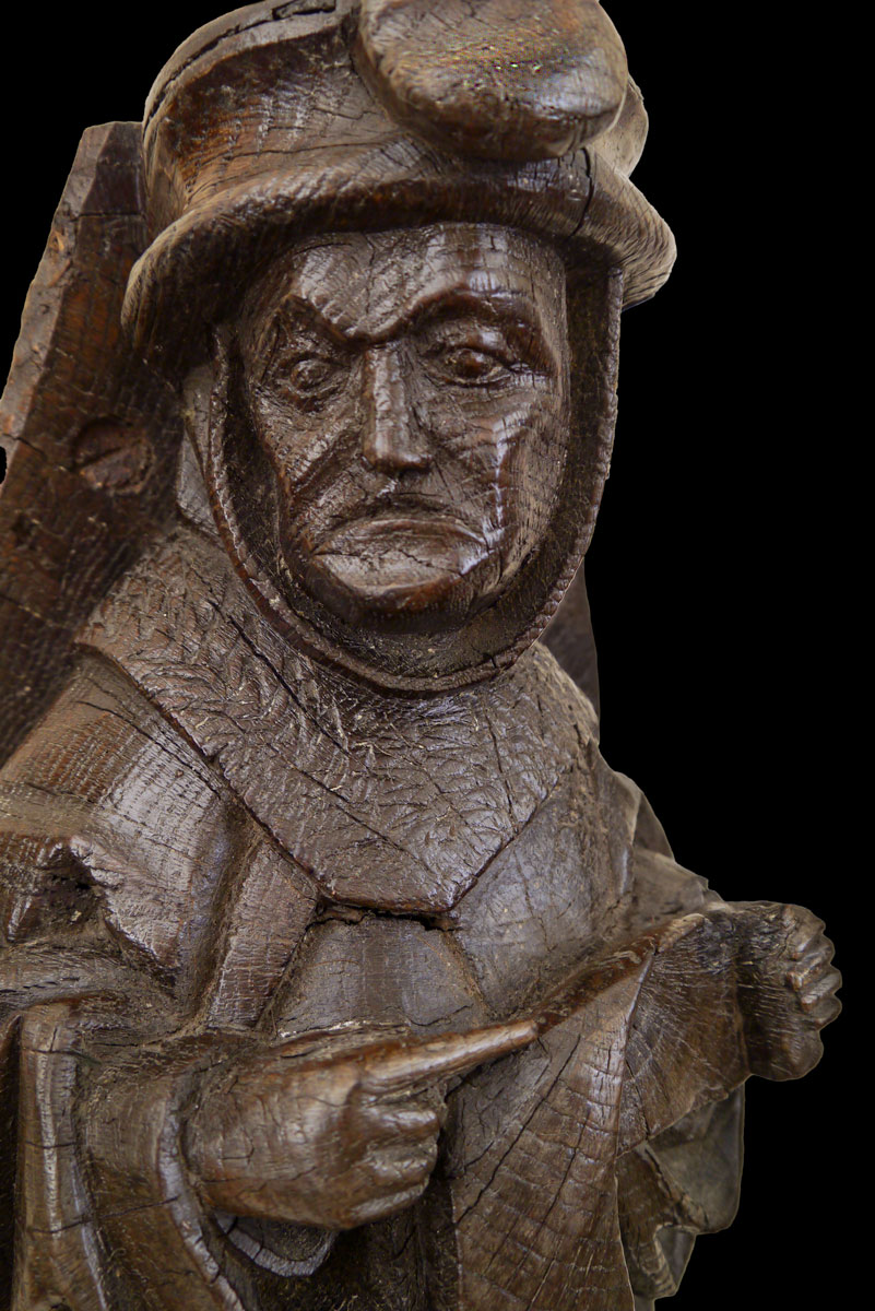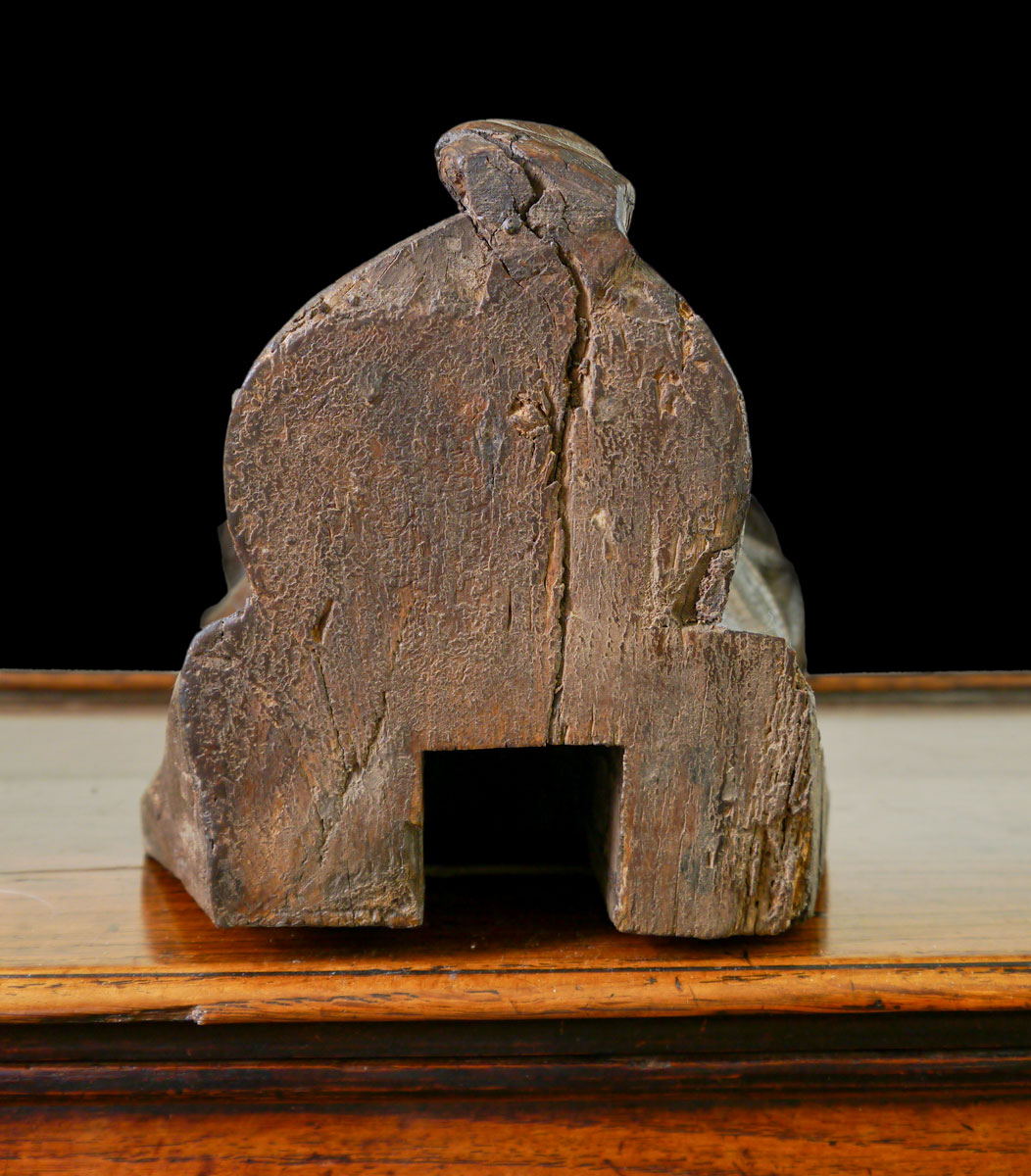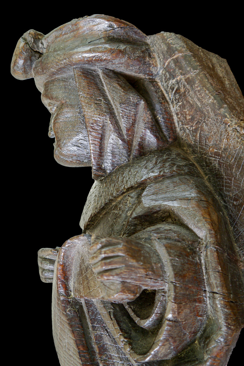 Both figures would have been part of horizontal structural roof beams, and retain the large mortices, into which the roof joist tenons would have been housed. Almost certainly, the original building they were from would have been secular – and important – rather than ecclesiastical.