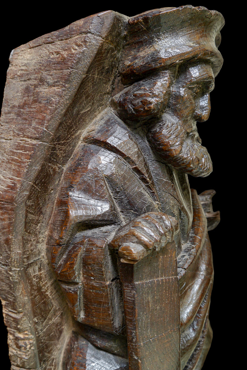 Carved in great detail, the male with slightly inclined head, and gentle facial expression, sports a full beard and curly hair, which escapes from under a flattened hat. The full-length figure is wearing a gown, which he gathers in his left hand, and holds the end of a scroll in his right hand.
