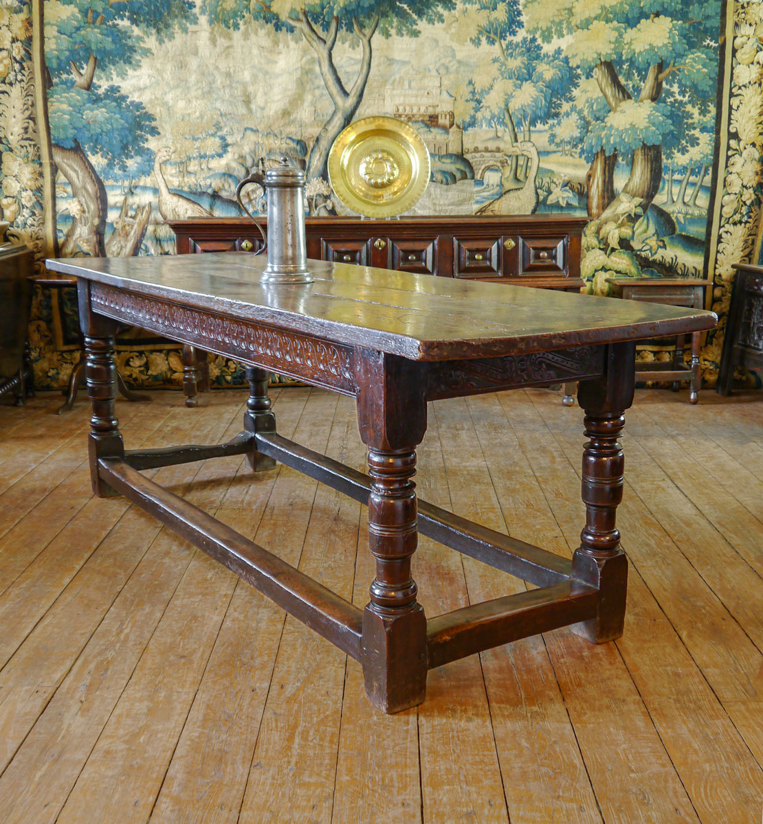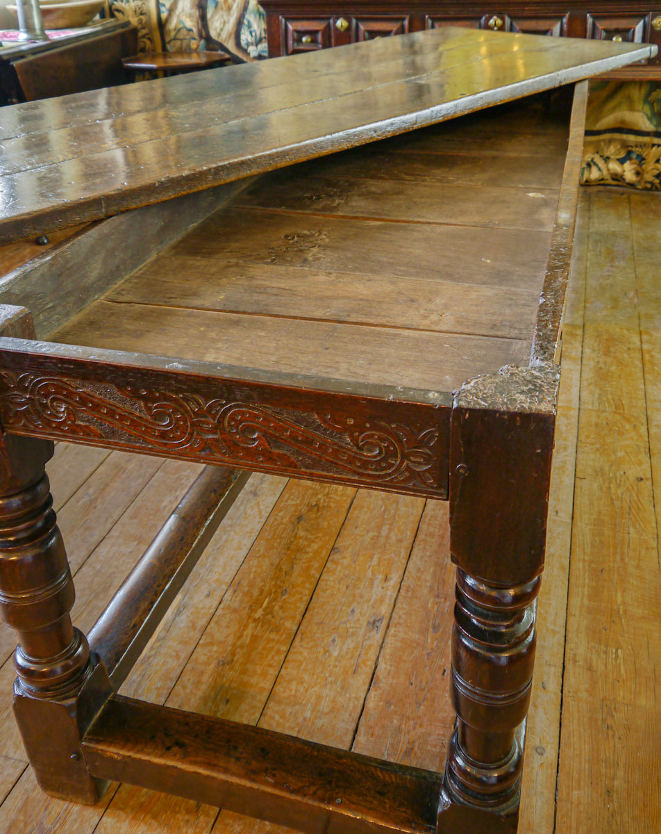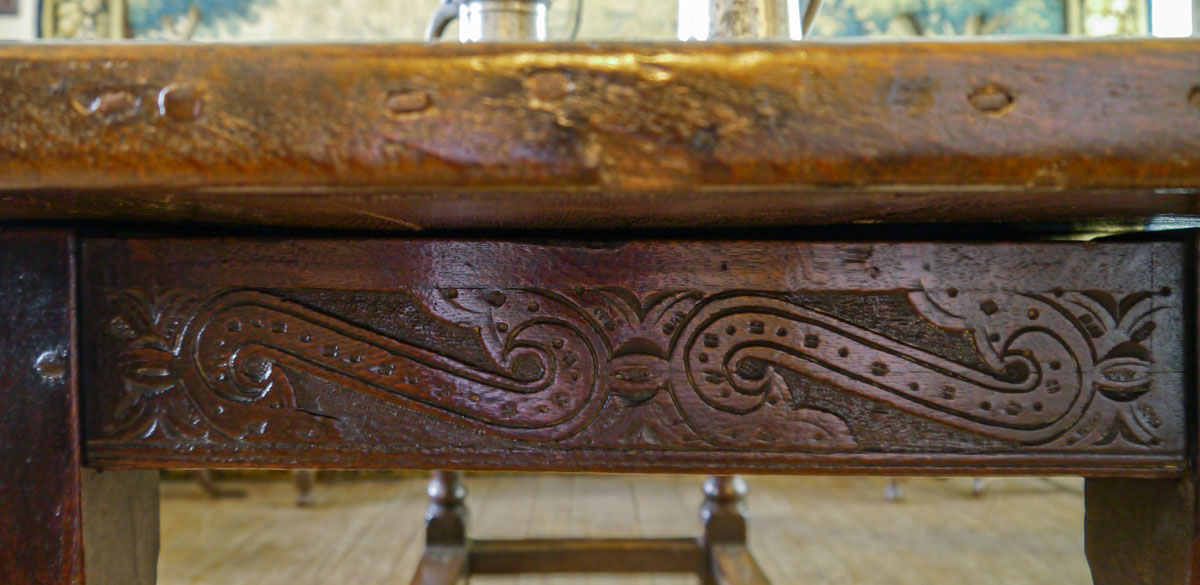 The thick three-plank top, retaining the original end cleats, sits on a wonderful base. The front and end rails, carved with elongated “S” curves, whilst the back rail has a simpler “chain” motif. All the carving is embellished with “punch” decoration.