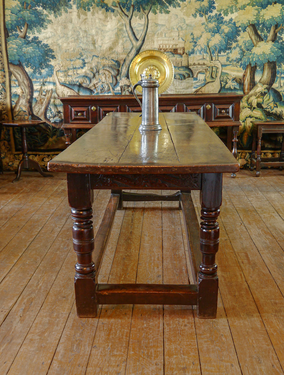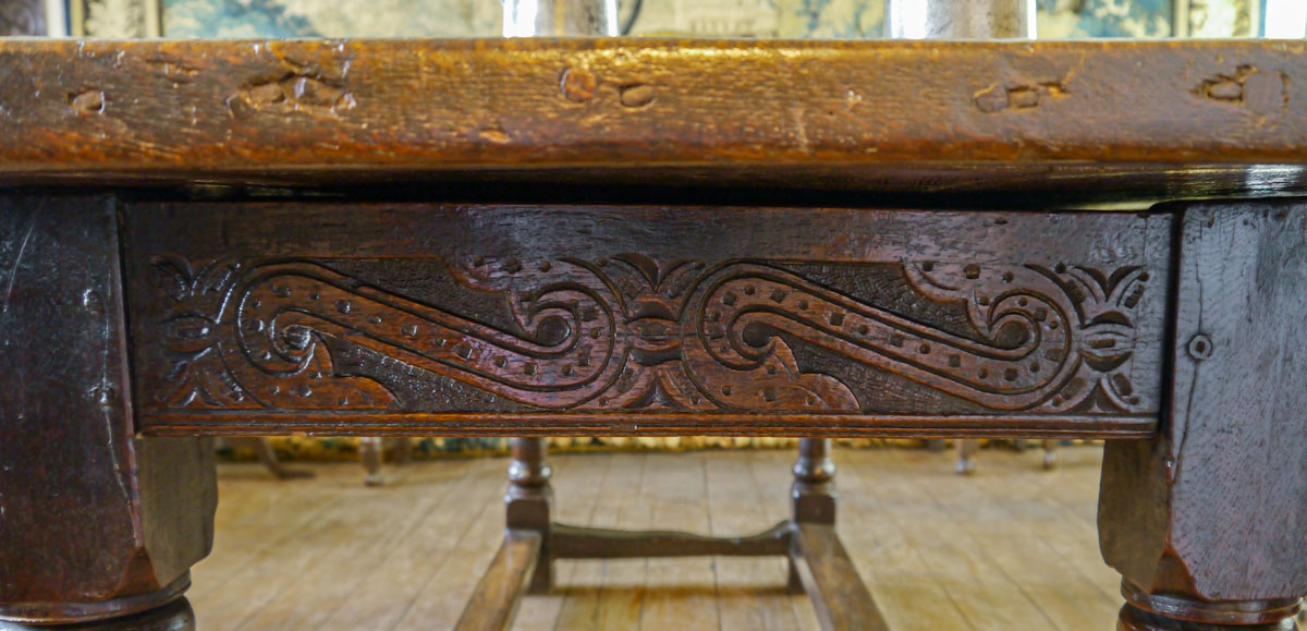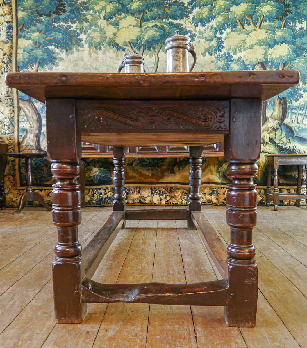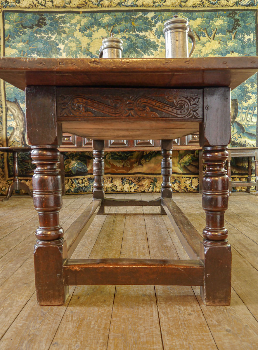 The thick three-plank top, retaining the original end cleats, sits on a wonderful base. The front and end rails, carved with elongated “S” curves, whilst the back rail has a simpler “chain” motif. All the carving is embellished with “punch” decoration.