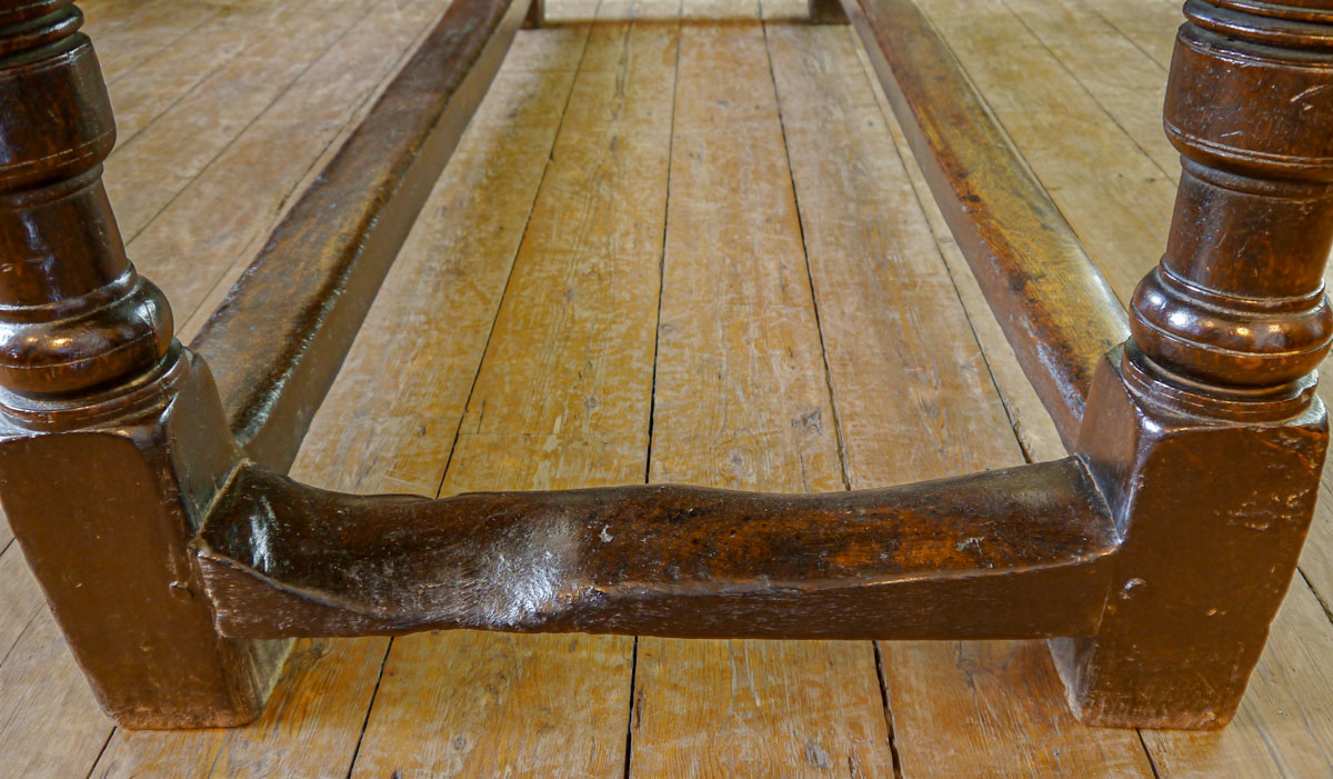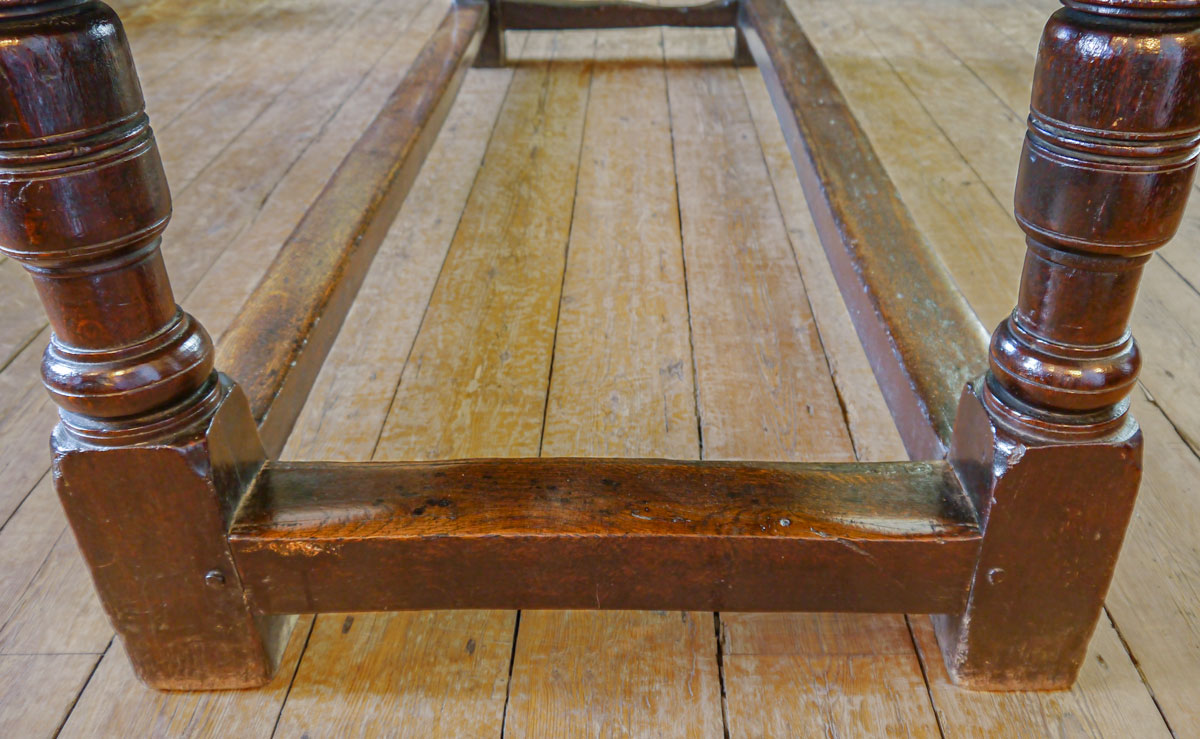 The boldly turned legs are worthy of note. Each varies very slightly, both in diameter and pattern, reminding us that the turner’s skills were “by eye”, rather than mechanical precision. The legs are joined by good stout sectioned stretchers.