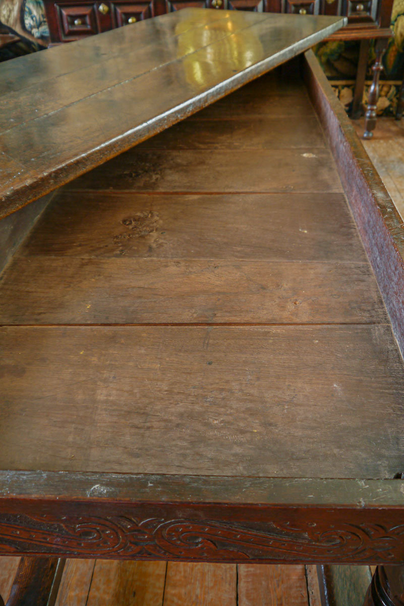 The highly unusual and remarkable aspect to the table is the “box” top. The four rails are rebated to take bottom boards, thus forming a shallow compartment, accessed by sliding the top, which has never been fixed to the base. This feature I have only seen once before, on a table, but is more commonly seen in chests of drawers or buffets, which have a lift-up lid to reveal the compartment below.