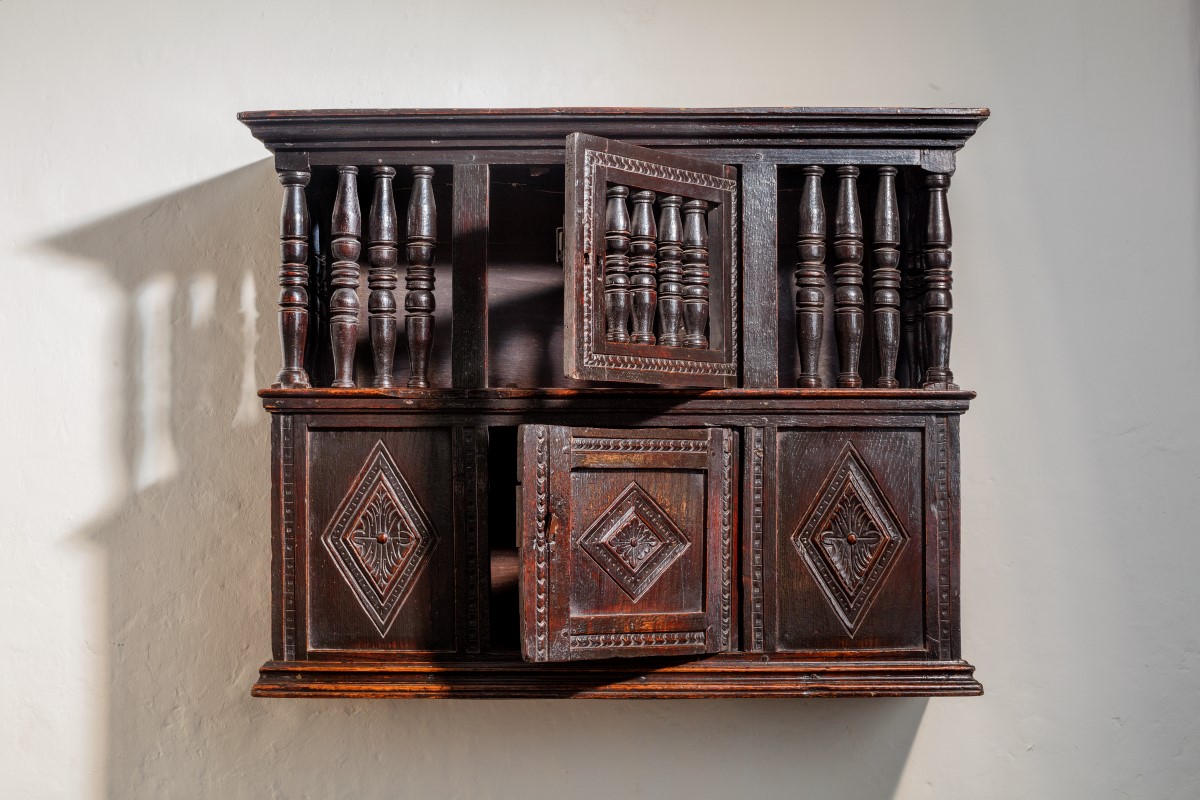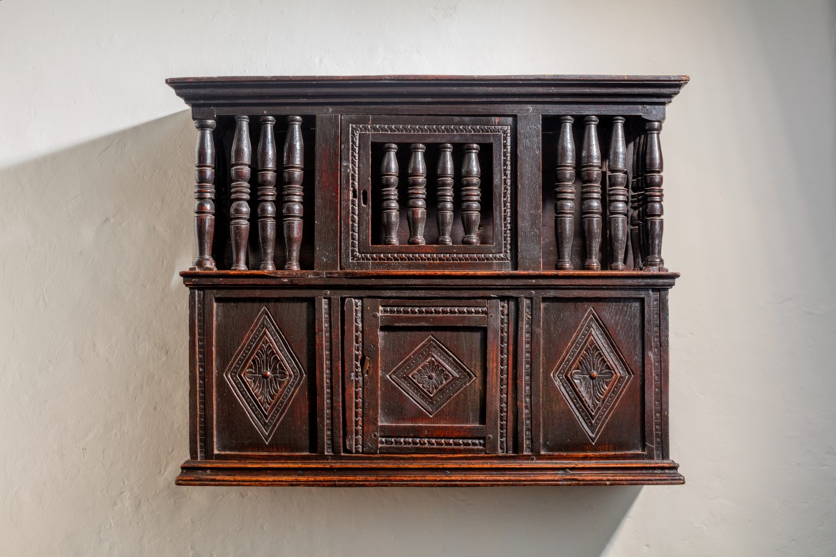 A beautiful early seventeenth century oak wall hanging cupboard. The upper section, with turned ballusters incorporating a central door, the panelled base with lozenge carving (the panelled ends are carved in the same manner). The central door with a simple "chain carving", which matches the door above. This type of carving, together with the lozenge, would suggest this piece originated in Wiltshire. The colour and condition are both excellent; the oak having a lovely original skin.