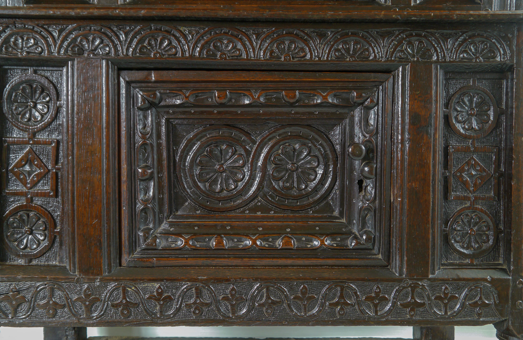 The single door to the top has a deeply recessed panel, with very well-moulded framework, and is carved with a single arch made up of small roundels. To either side of the centre panel are small vertical panels with tall flower-like devices supported on a stem with fleshy leaves. Inside the top cupboard is a concealed compartment with access through the floor of the cupboard.