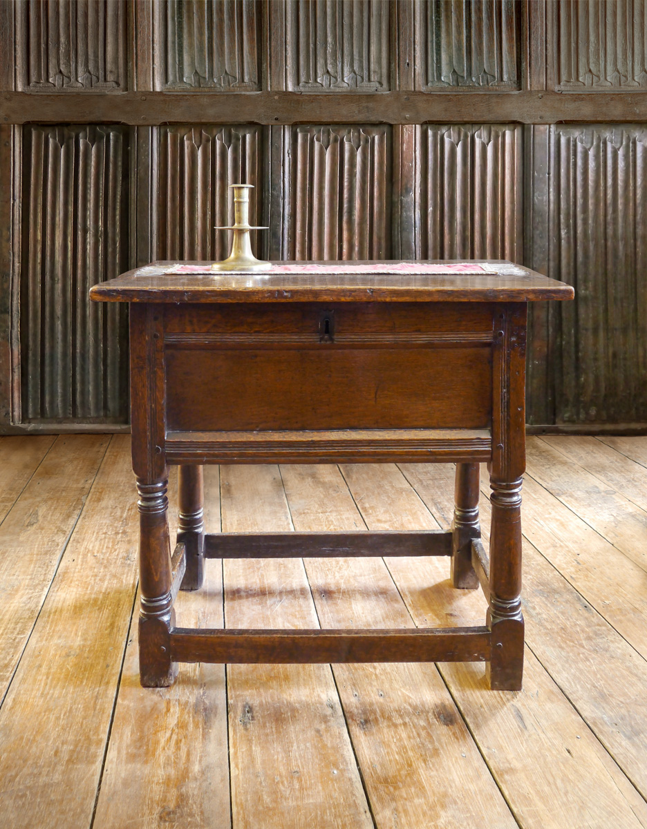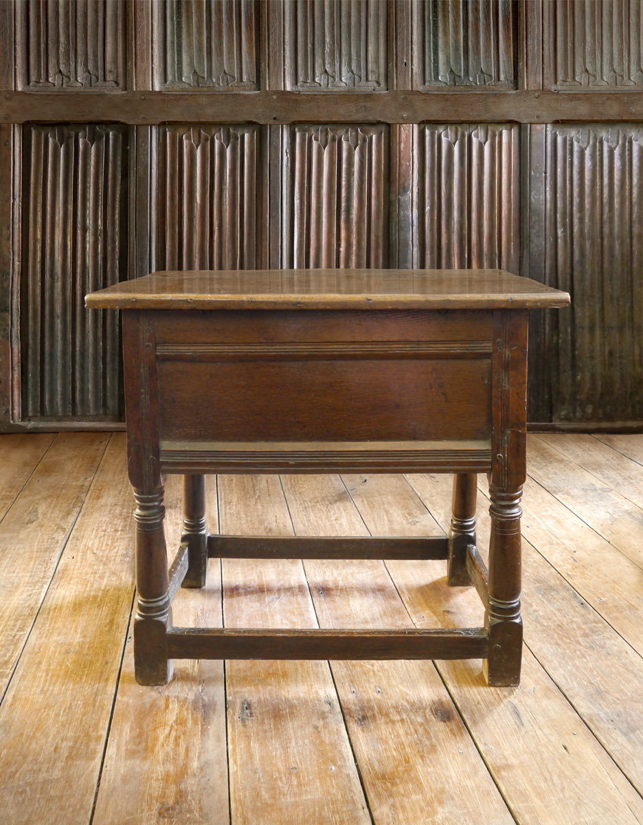The front, back and sides are panelled, each panel set in a frame decorated with run-mouldings, each face being identical, suggesting that the piece was intended to be seen from all sides (a centre table, rather than a side table).