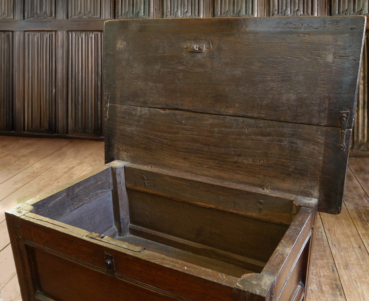The twin boarded top, lifting on the original iron pin hinges, reveals a vacant interior with a single board forming the base.