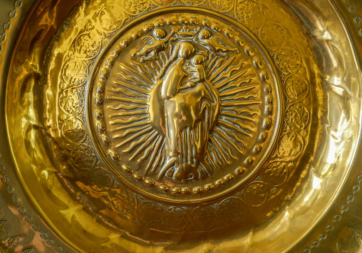 This is a more unusual variation of the Madonna and Child dish. Here, Mary does not hold a sceptre and supports Jesus on her left arm. Over Mary's head are two hovering angels holding a crown, she is standing on a moon, and in front of an aureola.