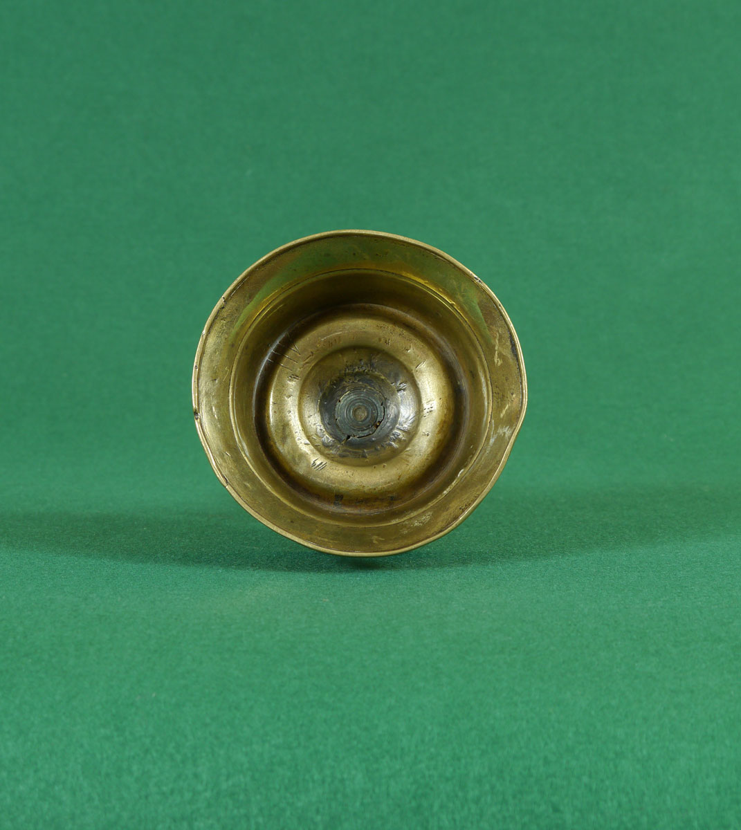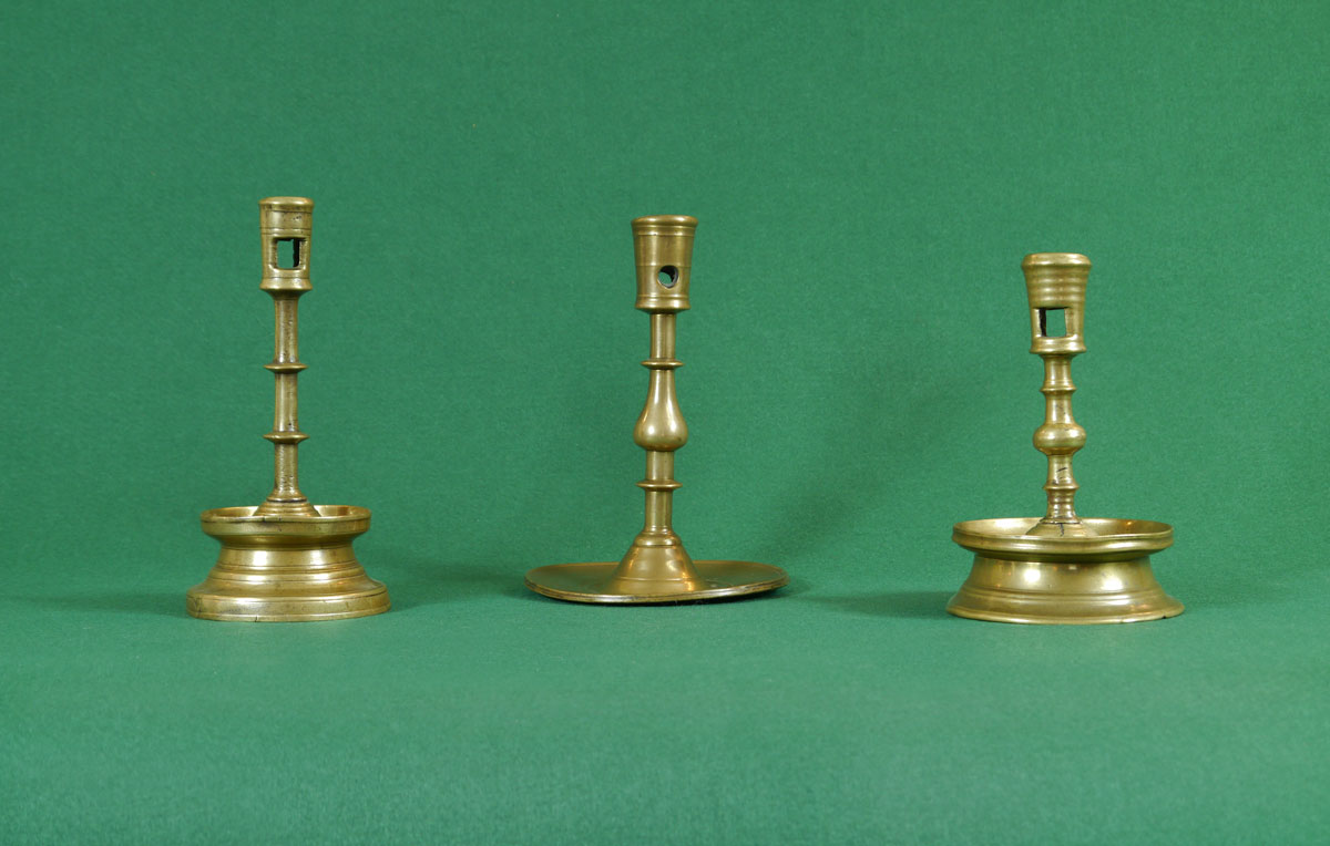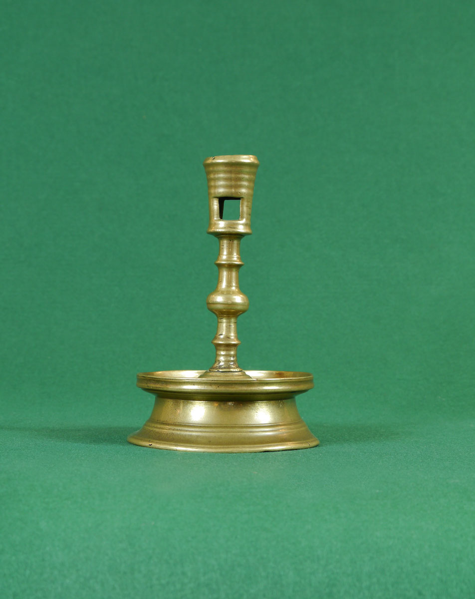 The tapering nozzle, decorated with ring-turnings above a stem with a pronounced centre swelling, between two discoid rings, sat on a base with a flared foot and upturned edge to facilitate the collection of used wax.