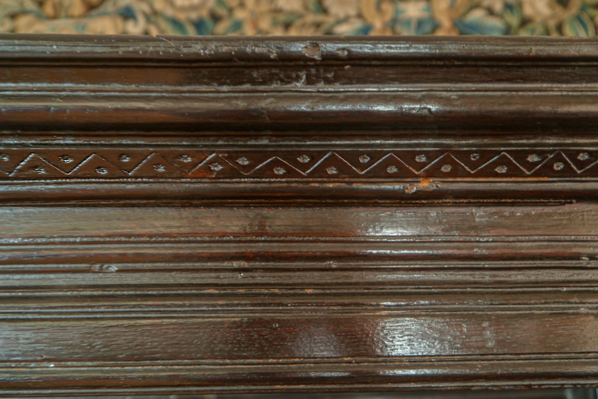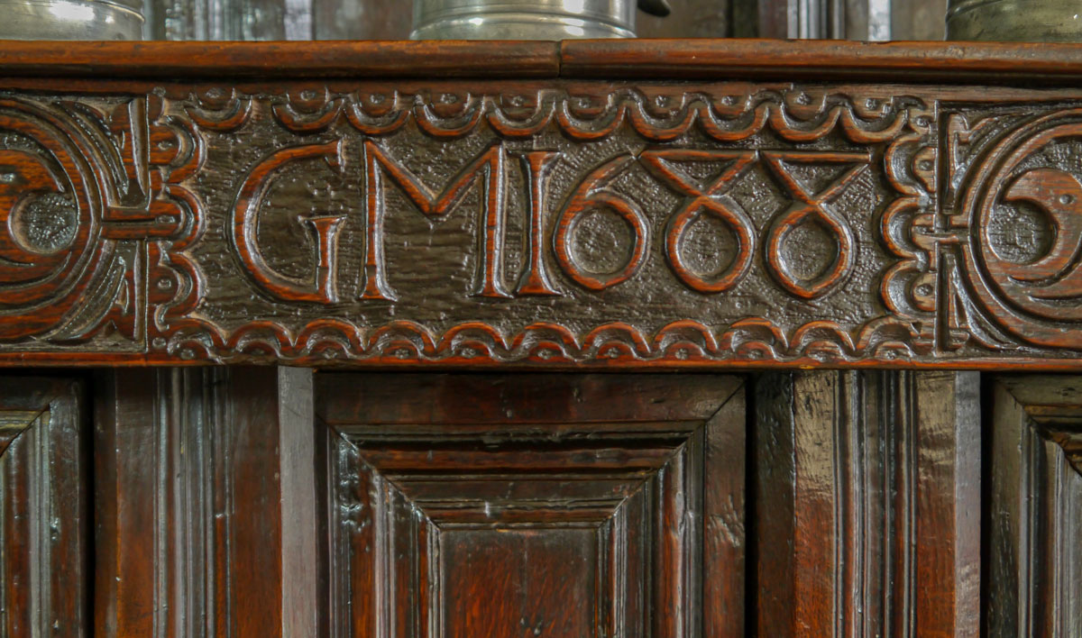 Retaining the original canopy which has a panelled back and well-turned baluster front supports. The centre section has a carved top rail terminating in well-turned pendants, whilst the rail itself is carved with leafy āSā scrolls and bearing the initials and date GM 1688. Two cupboard doors, with decoration made up of complicated mitred mouldings, are set either side of a narrow door opening to a narrow compartment.