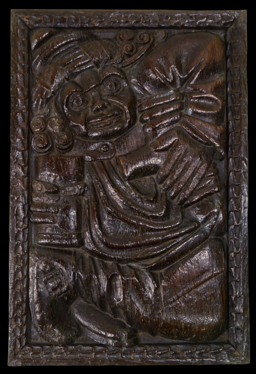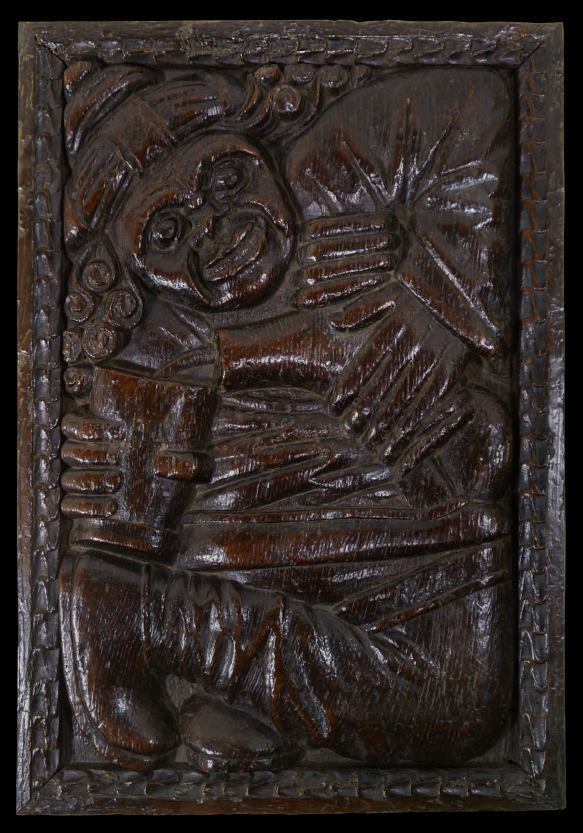 The first panel, showing the joyful jester’s face as the ale or cider flows from the flagon into his tightly held beaker. In the second panel, the face has gone from showing joy to despair, as the flagon has run dry.