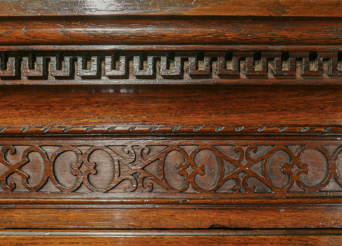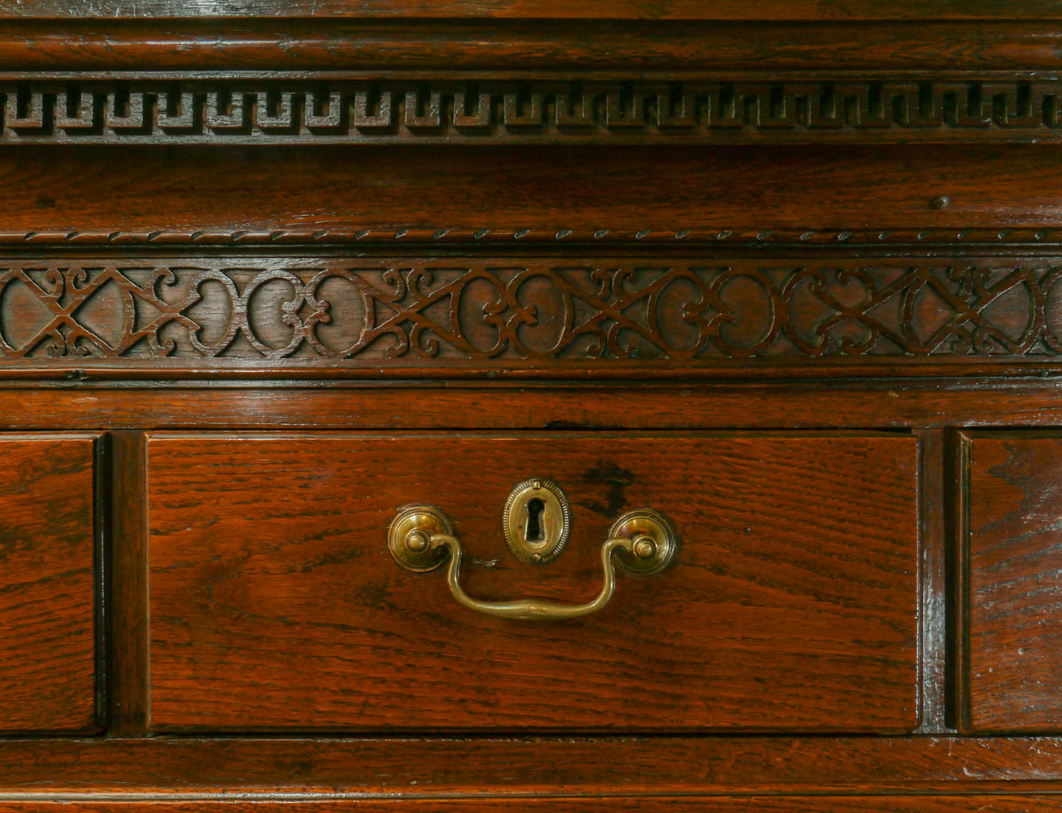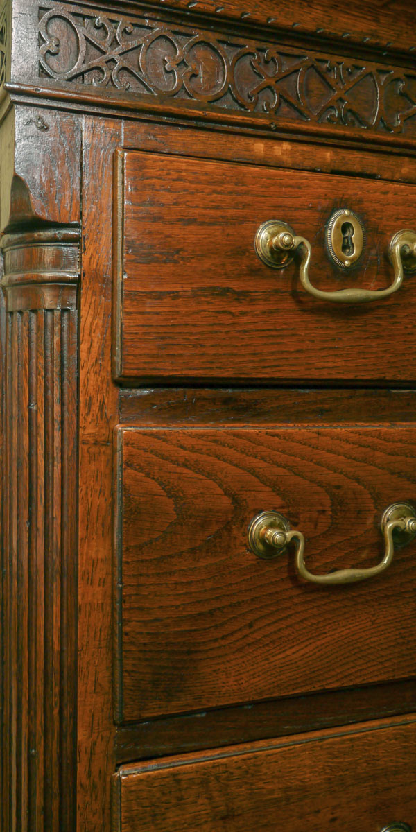 As in the case of the George II clothes press, the joiner here used the local slow growing Welsh oak throughout; topboards, backboards, are all stout boards, whilst the drawer linings are carefully thin-cut boards. The brass swan-neck handles and escutcheons are original.