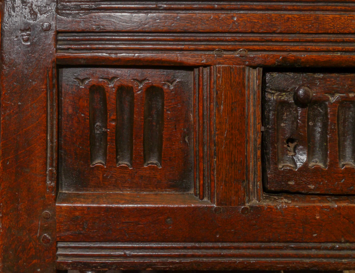 An outstanding piece of early 17th century English furniture. The twin boarded top above a gouge-carved front, containing a small panel and hinged door, which opens to an interior with concealed lipped shelf behind the single panel.