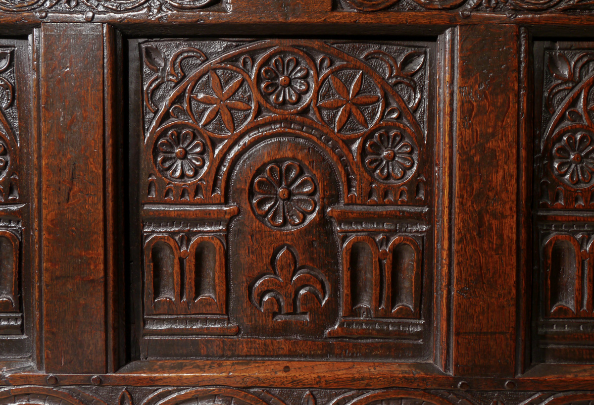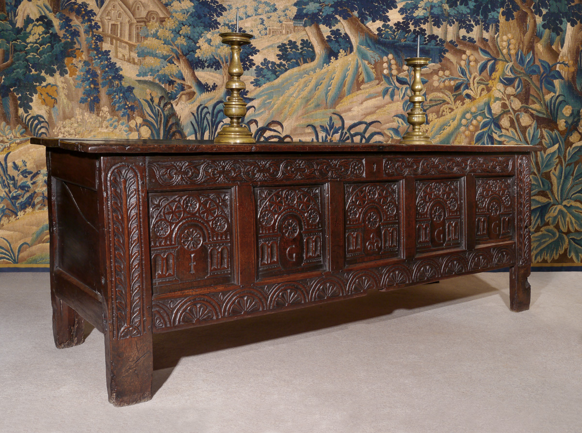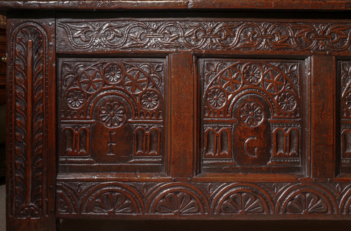 The massive three-plank lid, held on iron strap hinges, above a richly carved five panel front. The top rail, carved with S-scrolls, above semi-circular arches, supported on short nulled columns. The centre of each arch with a stylised daisy head above initials ‘I G’ (probably J G) and ‘G G’, suggesting the piece was made to commemorate a marriage. The broad stiles, carved with fleshy fern-like leaves, whilst the bottom rail has a half round motif with stylised flower-heads. The carving is very typical of Gloucestershire, circa 1630.