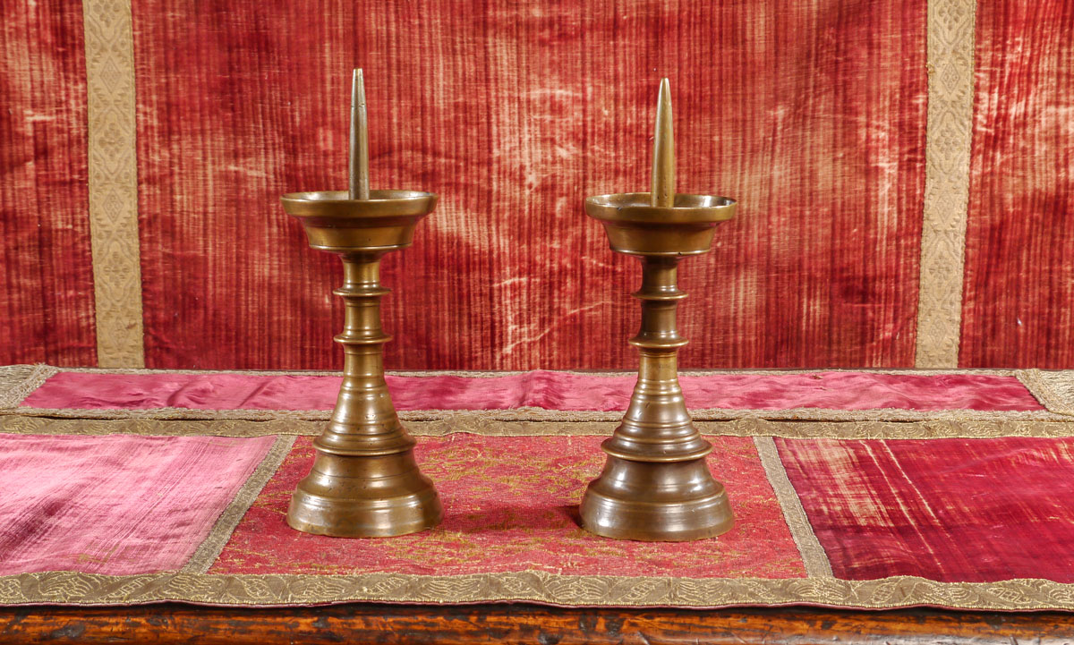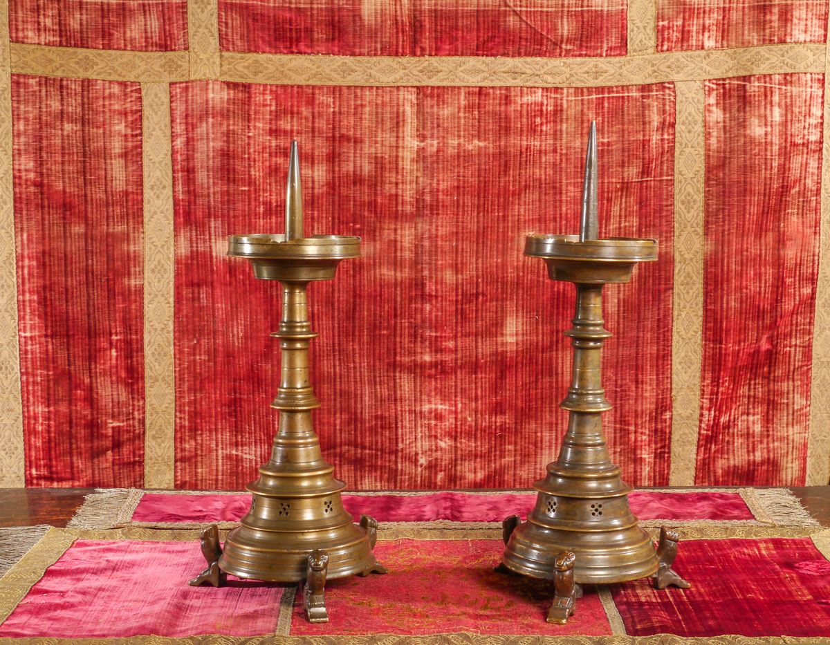 An Extremely Rare Pair of 15th Century Pricket Candlesticks, height 17in, Ref 710