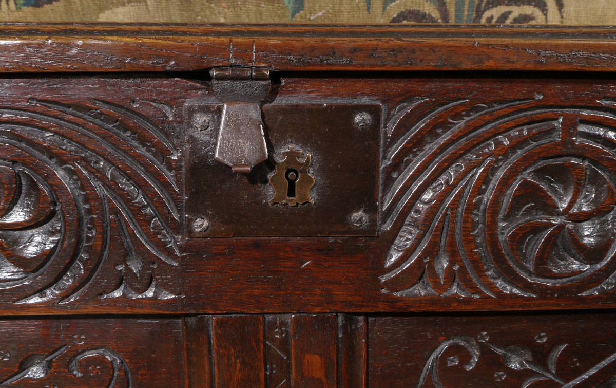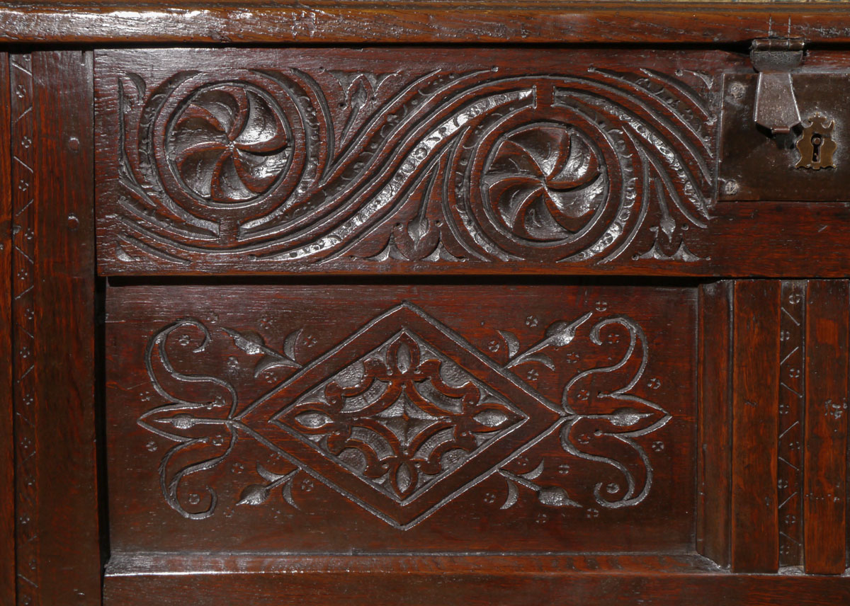 The three-panel lid, retaining the original pin hinges, above an exceptionally deep top rail, which is boldly carved with a trailing āSā motif, and symmetrical whorls, and retains the original iron lockplate. The two panels have a lozenge carved centre, with stylised tulip heads coming from the pointed ends. The stiles, muntin and bottom rail are all decorated with a flat run-moulding, with punched decoration.