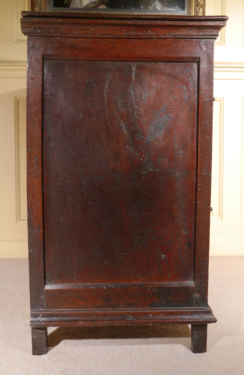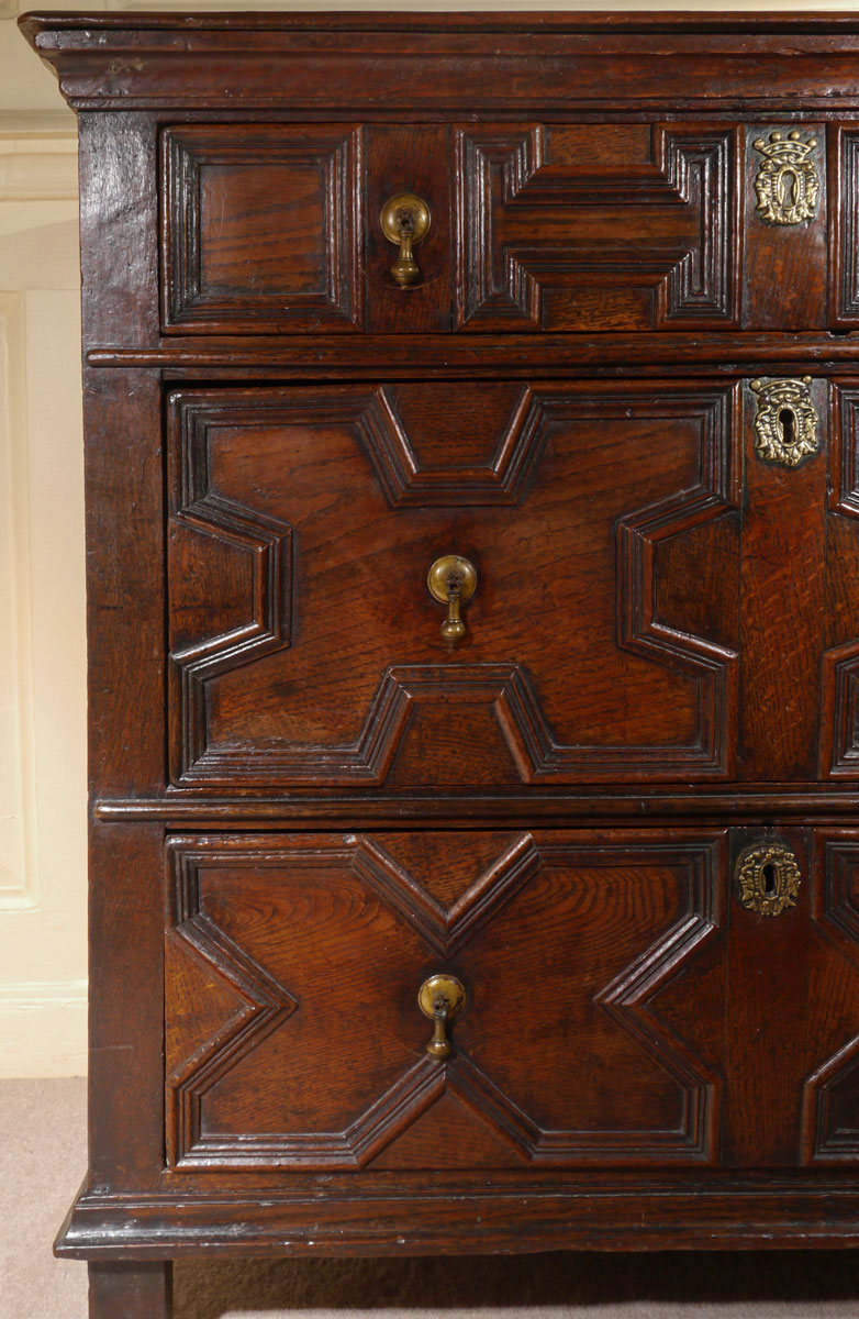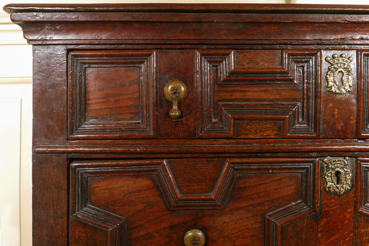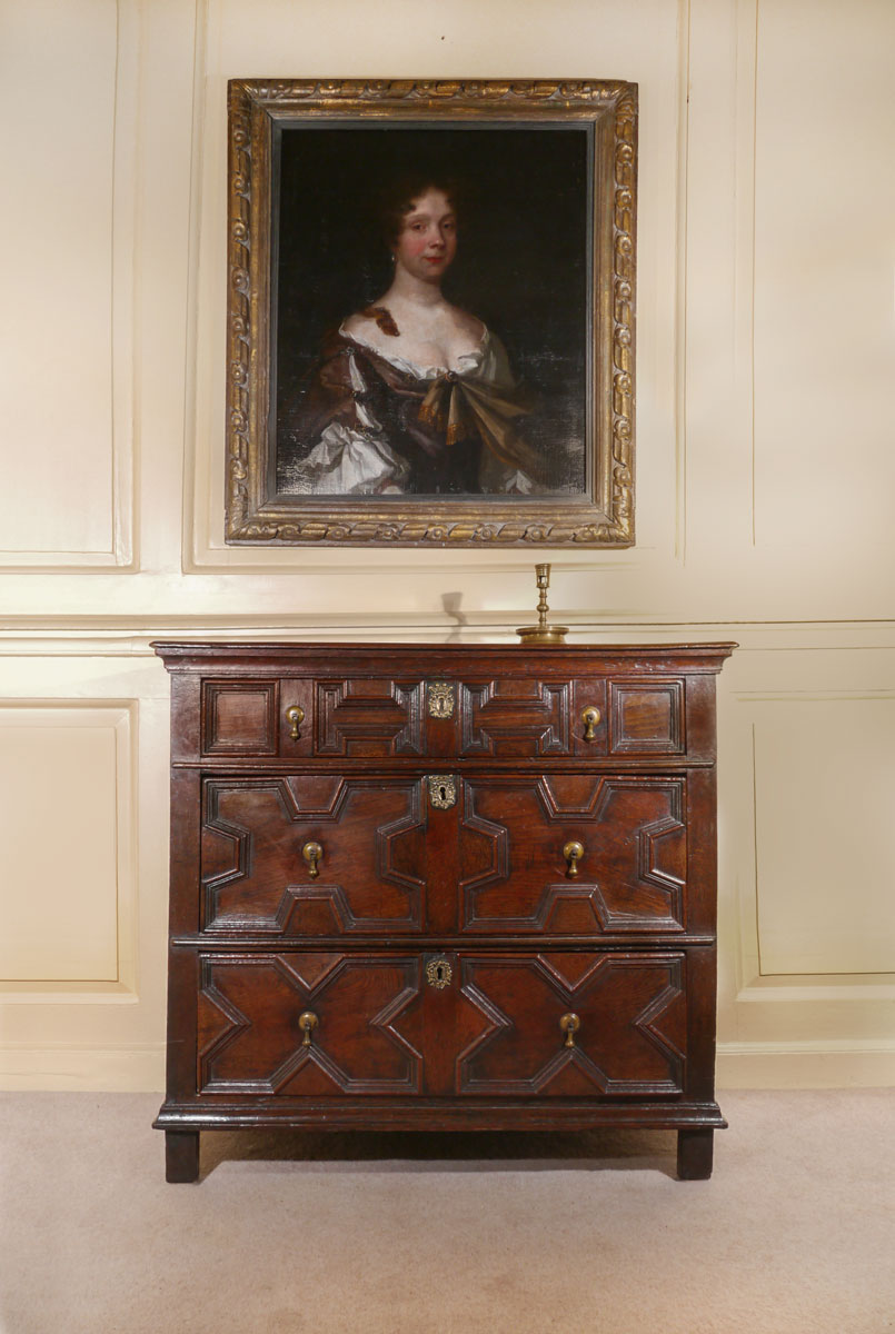 The three drawers, all of which are “side-hung” (the drawer sides are rebated out back to front, to take the runners), are decorated with intricate mitred mouldings and sit below a two-plank top which is secured by fine small oak pegs to the moulded underframe. The stiles extend below the concave base moulding to form short feet.