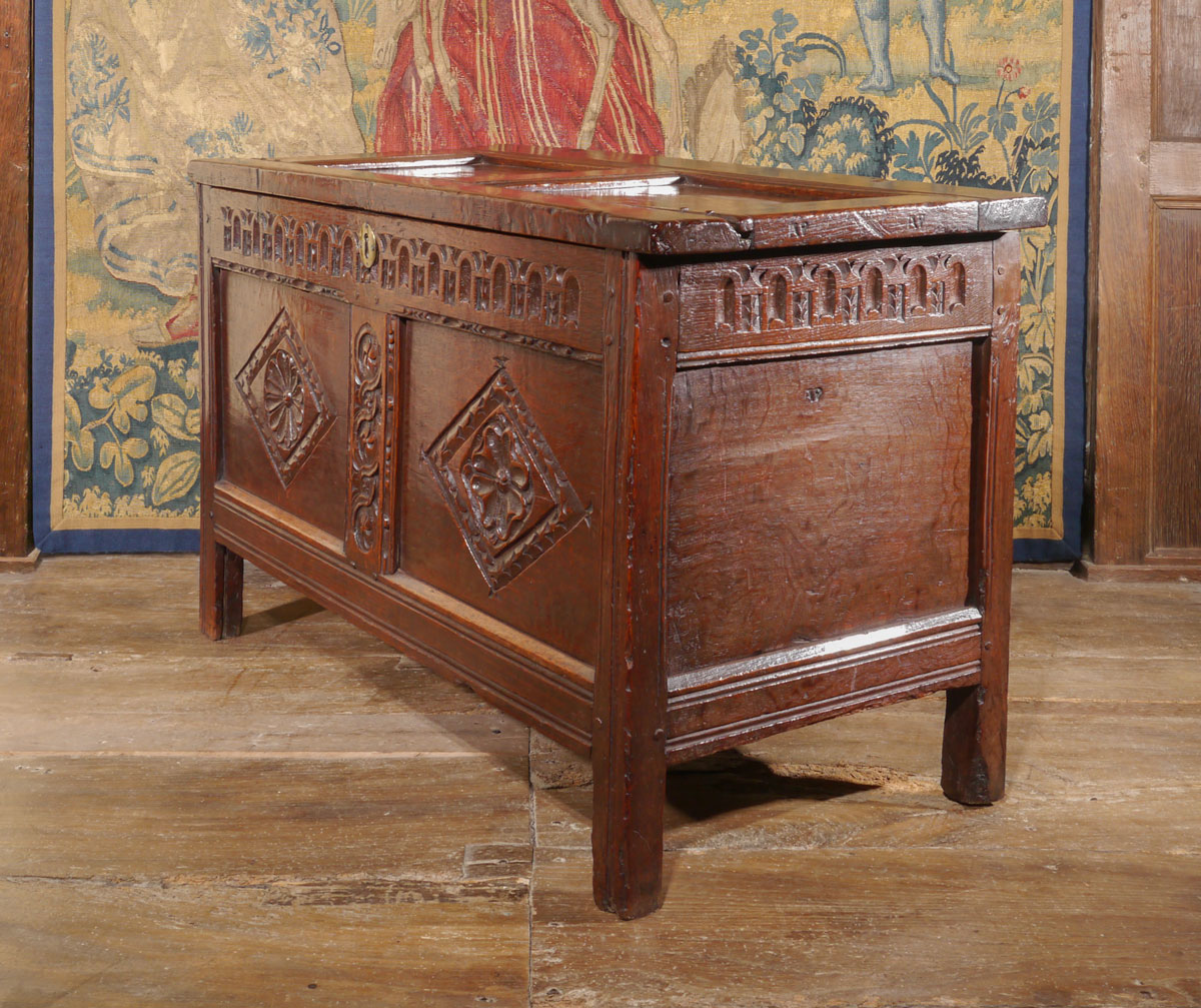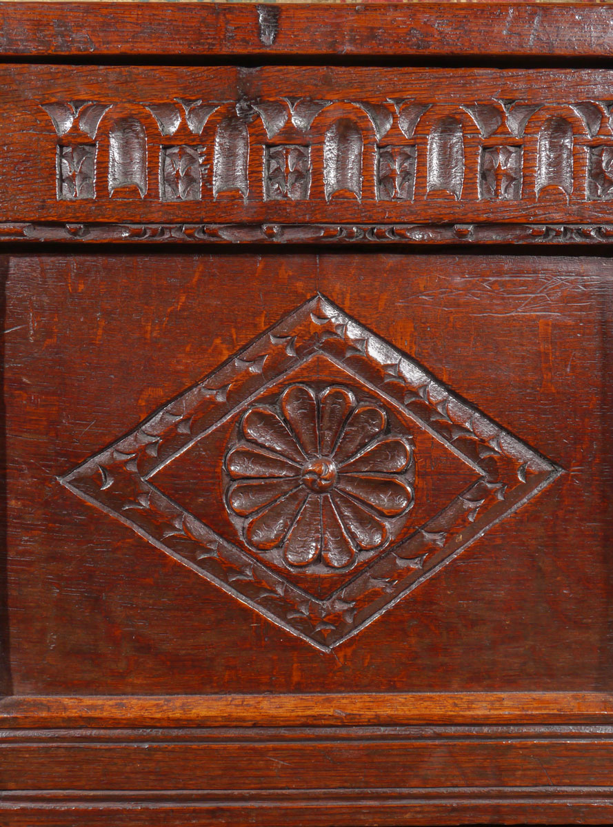 The two panel lid set within a run moulded frame. The front with a thumb or gouge carved top rail, which is repeated around the sides. The centre muntin, which has a vertical line of guilloche carving, divides the two lozenge carved panels, which unusually have different stylised flowers to the centres. The panel to the right is a Tudor rose, whilst the panel to the left is a daisy head.