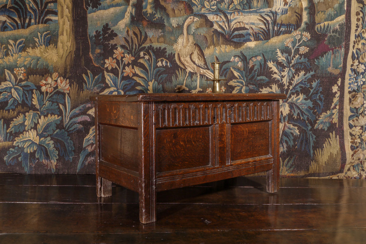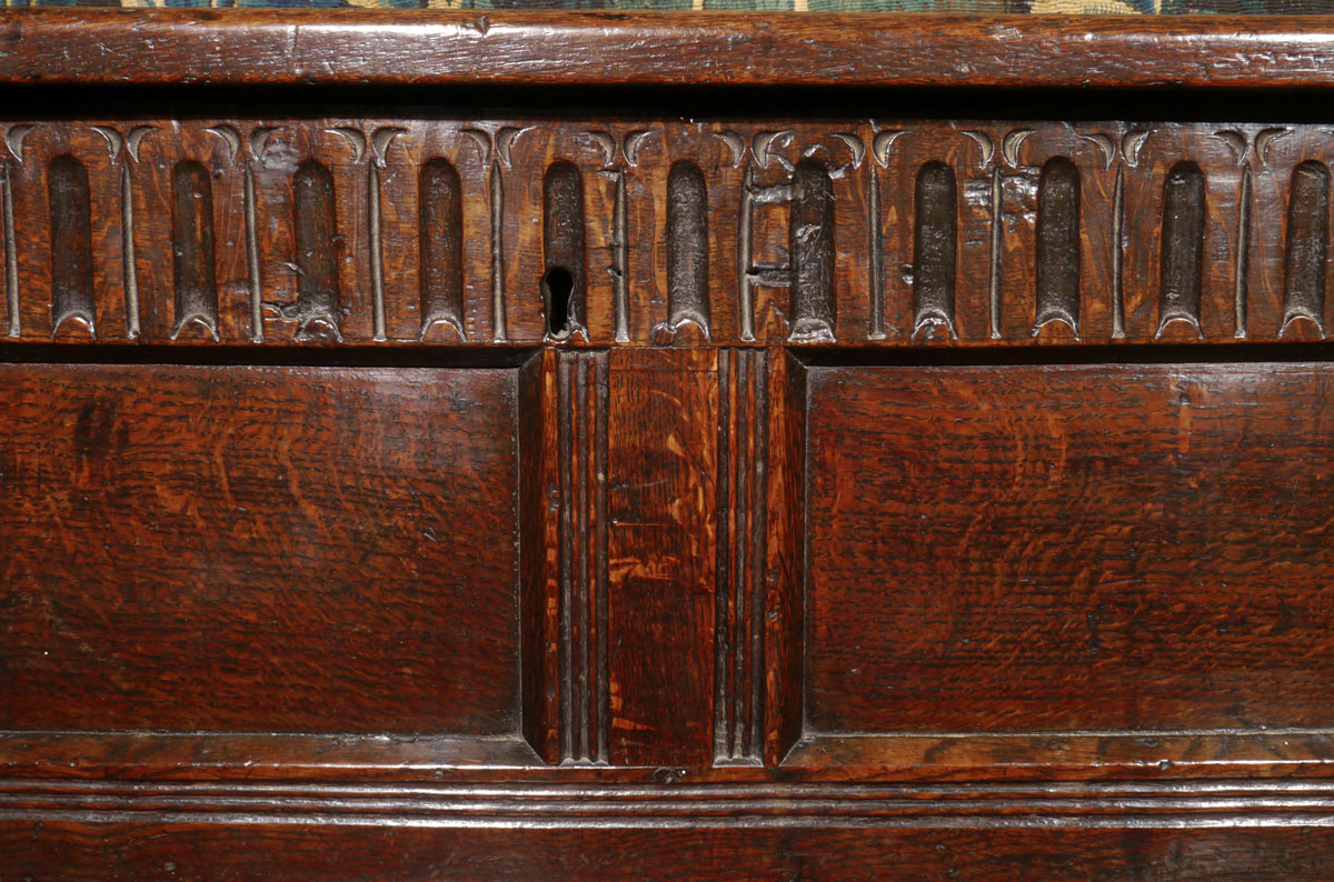 The lid, with twin panels, set in a run-moulded frame, retaining the original iron pin hinges. The front rail, with nulled decoration, above two panels which are again surrounded by a run-moulded frame.