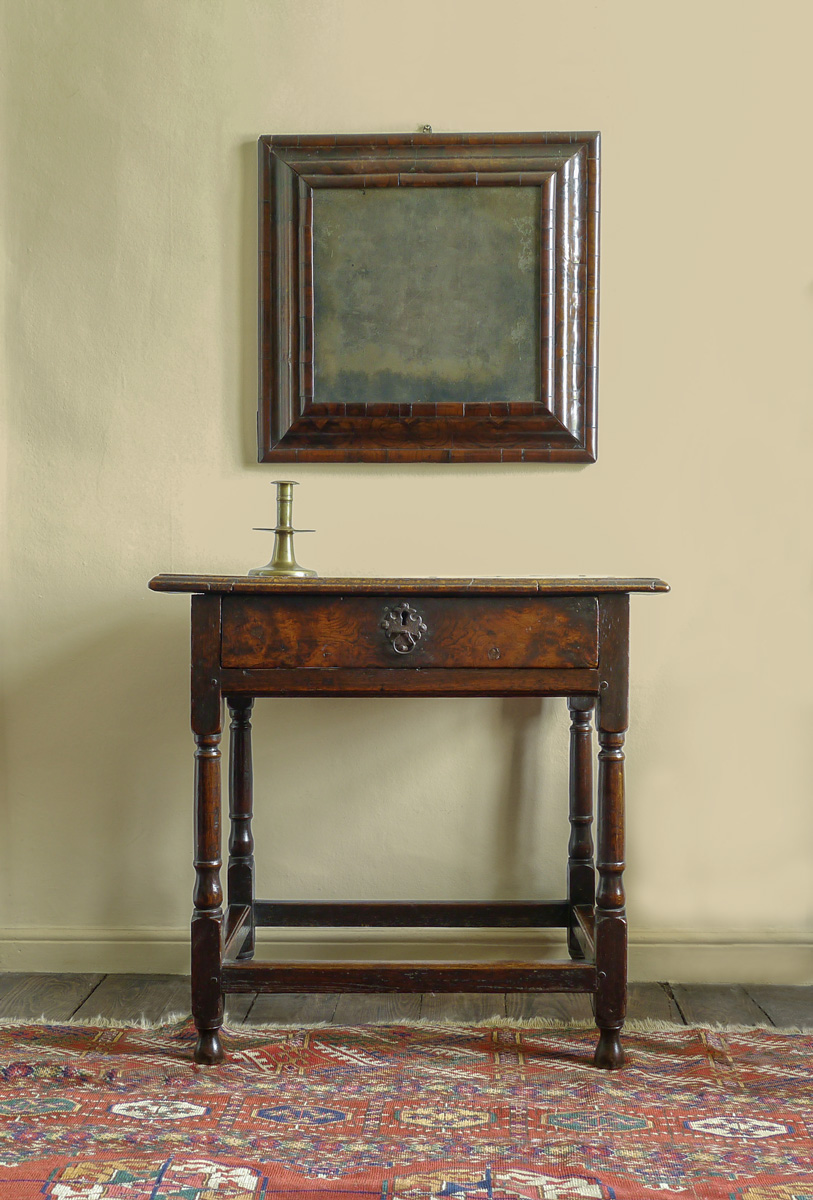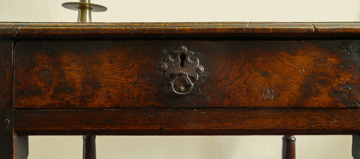 Elm was often used in furniture making in the Wiltshire/Dorset area, and the lozenge motif found in the drawer bottom is also a West Country design, so I would say the table was West Country, circa 1680-90.