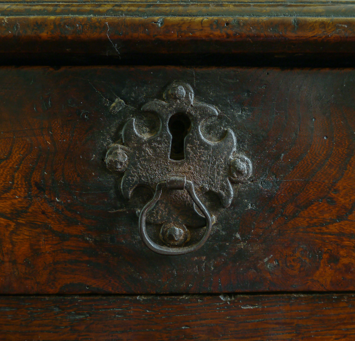 Interestingly, and with regard to thrift, the joiner has re-used two lovely oak panels for the bottom of the drawer, each cared with a lozenge design.
