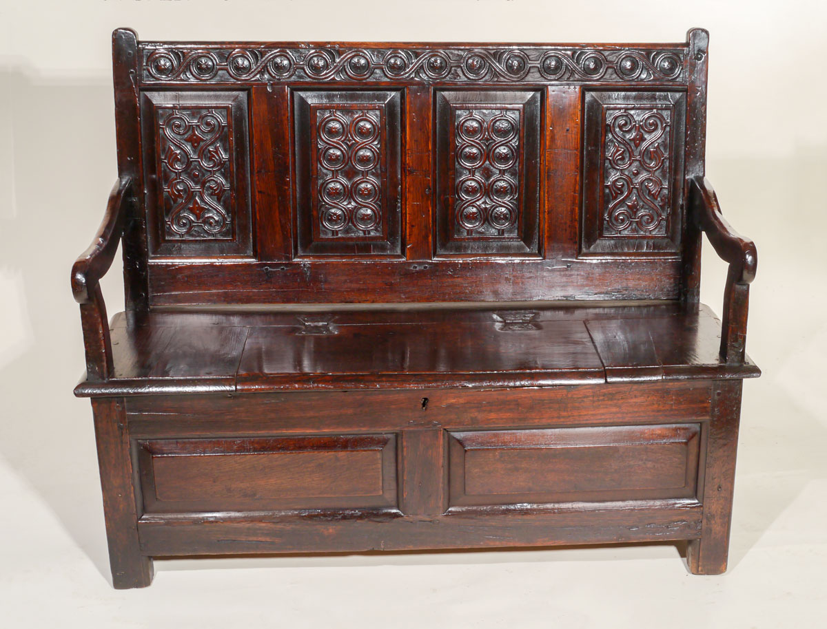Having a carved, four panel back, below a floral guilloche carved top rail, set within plain uprights. The box base, with boarded seat, is enclosed by simple, raised panels.