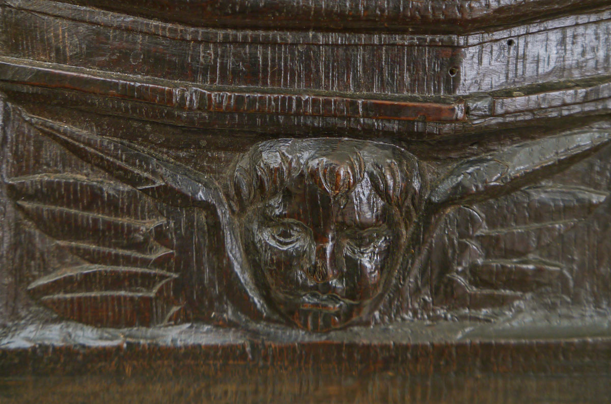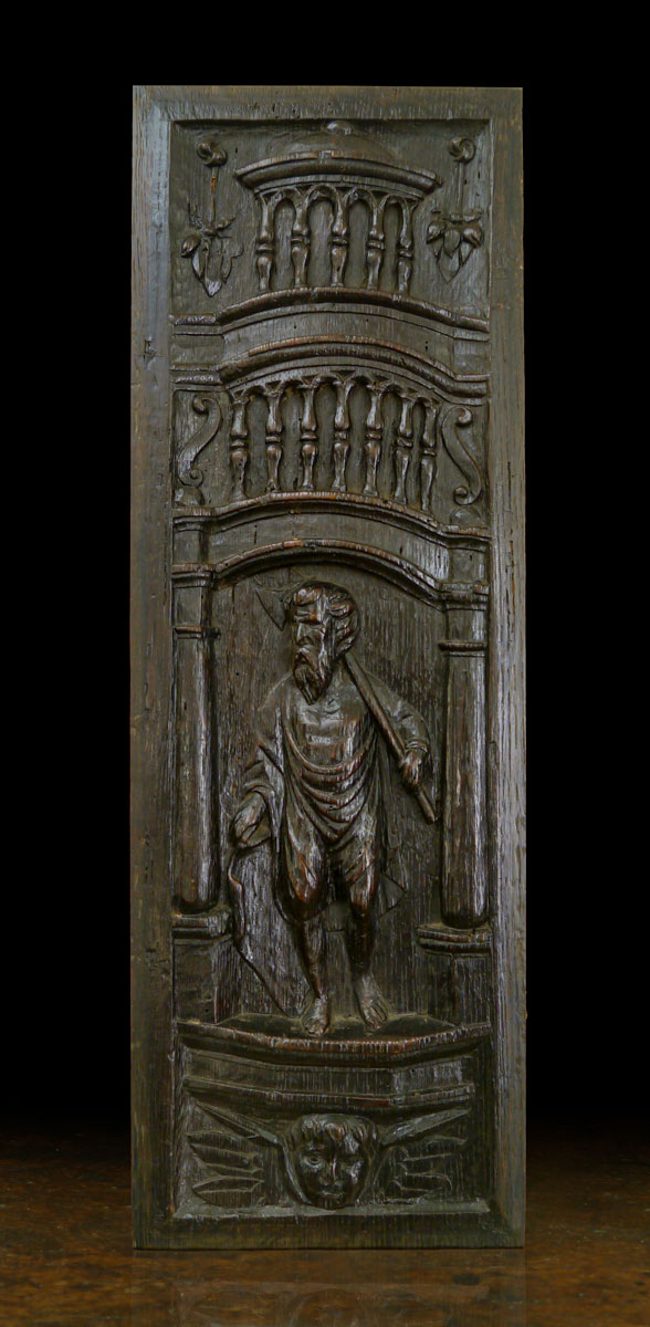 Carved in exquisitely fine detail, the figure stands in an arched niche, supported on tapering pillars, below two tiers of wonderfully executed balustrading. The upper tier, surmounted by a domed pediment.