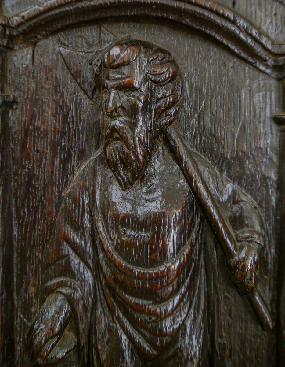As is typical, Matthias is depicted with short hair, beard, and carrying an axe (he was sadly decapitated). The saint's niche is supported by a winged angel.