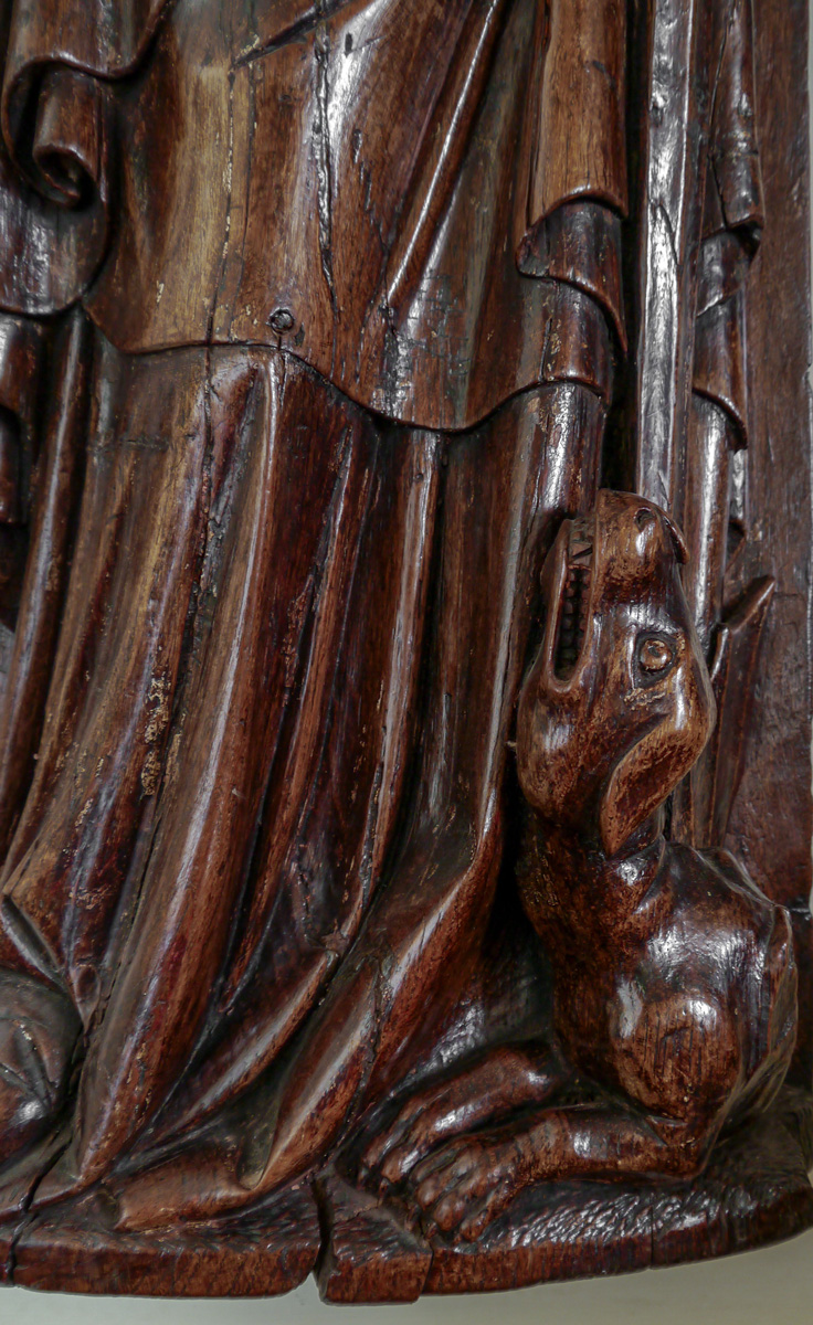 A most impressive sculpture of St Margaret of Antioch (patron saint of childbirth and midwives). Having a gentle face, with curled hair showing beneath her shawl, she stands with her right leg slightly bent forward, giving her a more relaxed appearance, often referred to as the “soft” style, as opposed to the slightly harsher appearance of works before 1400. In her left hand, Margaret holds a sword, whilst a dragon looks up from the base. The colour of the walnut is outstanding, having been burnished for many years.