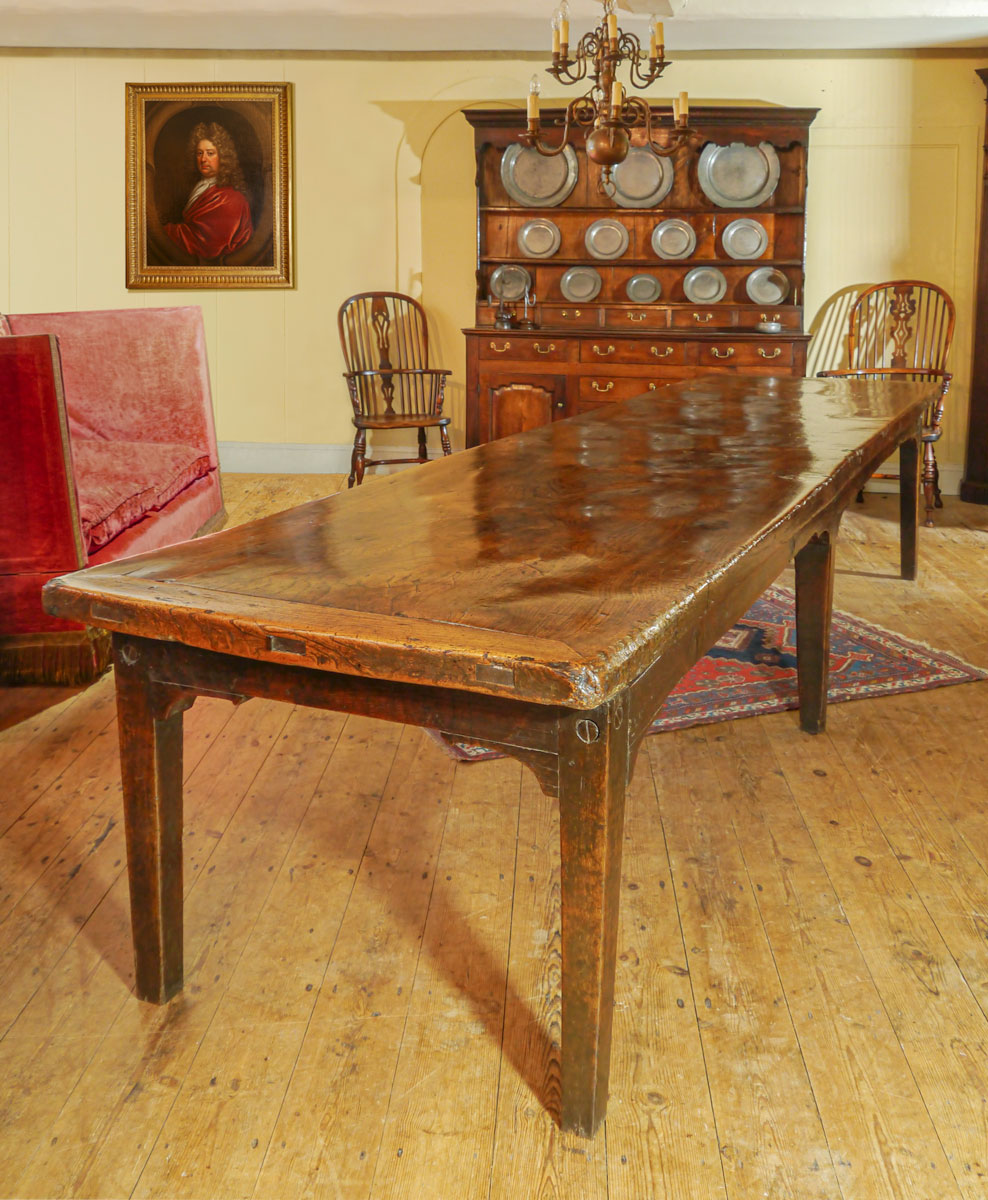 Having a wonderfully patinated top, made from a single board of well-figured elm, measuring an impressive 12 feet 10 inches long by 3 feet 2 inches wide, and almost three inches thick. Either end has a single cleat, which is mitred into the board and fixed with three wedged tenon joints.