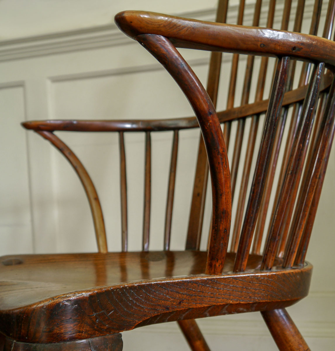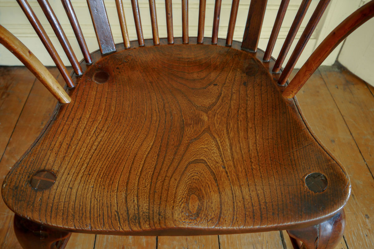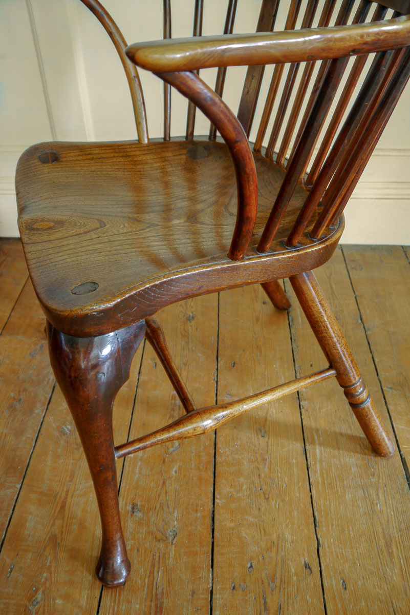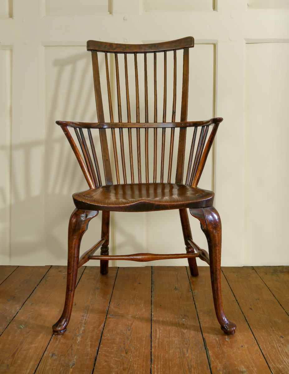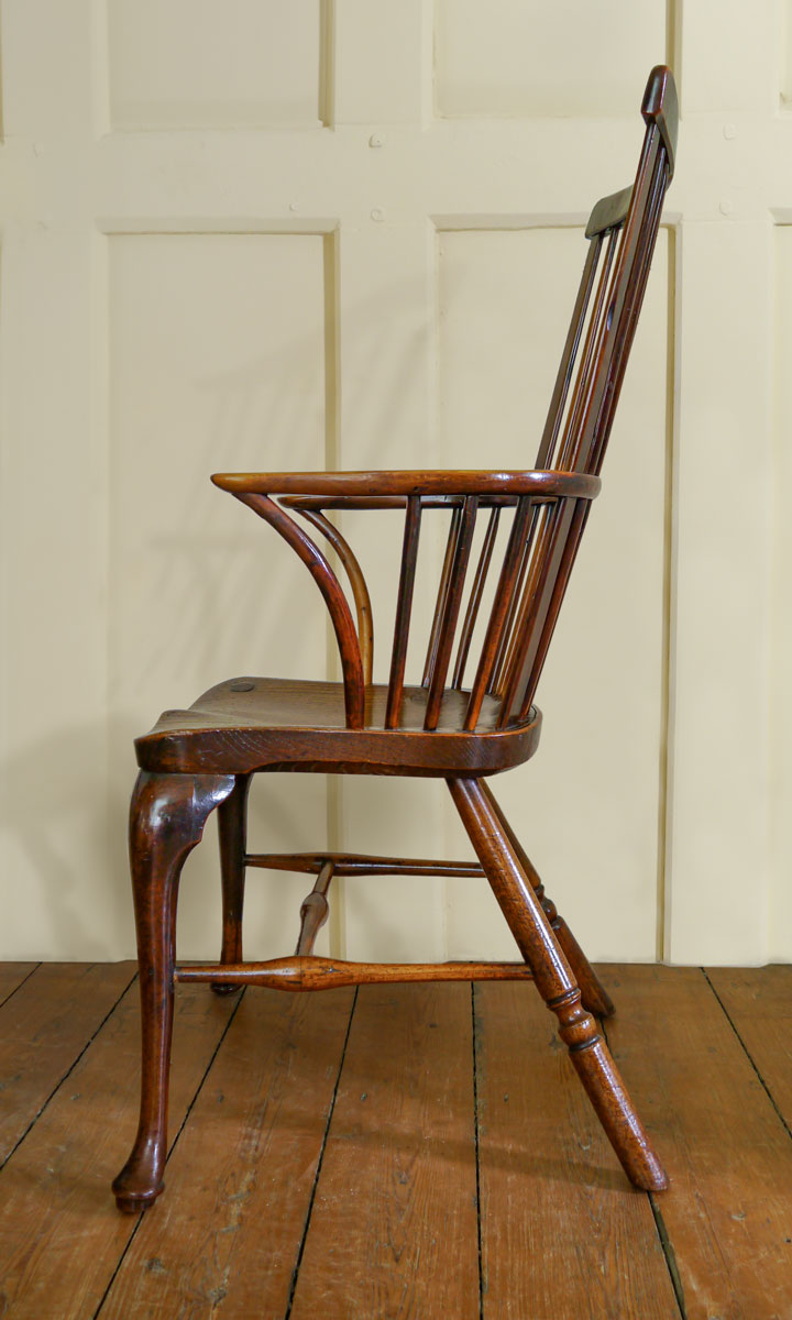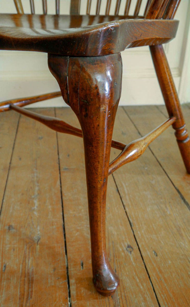 The tall back, with a curved top rail, supported on two out-splayed staves, the space between filled with tapering “sticks”. The hooped arm bow rests on down-curving front supports, again with tapering sticks behind. The wonderfully grained shaped saddle seat has a pair of elegant cabriole legs, morticed fully through the seat and then split and wedged in place, as do the tapering turned back legs. The legs are joined with turned stretchers.