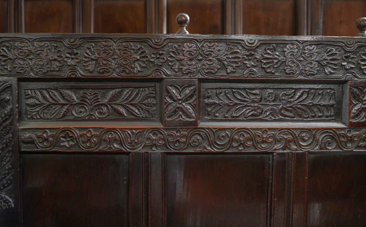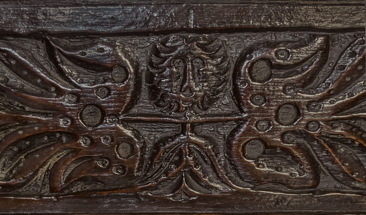 Below the top rail are four horizontal panels, the outer two with further carved leaf and flower designs, whilst the centre two have a small bearded face, with foliage extending along the arms – perhaps a symbol of the “green man”. The centre rail of the piece has a continuing and undulating carved design – the top section is finished with a pair of tight scrolled “ears”.