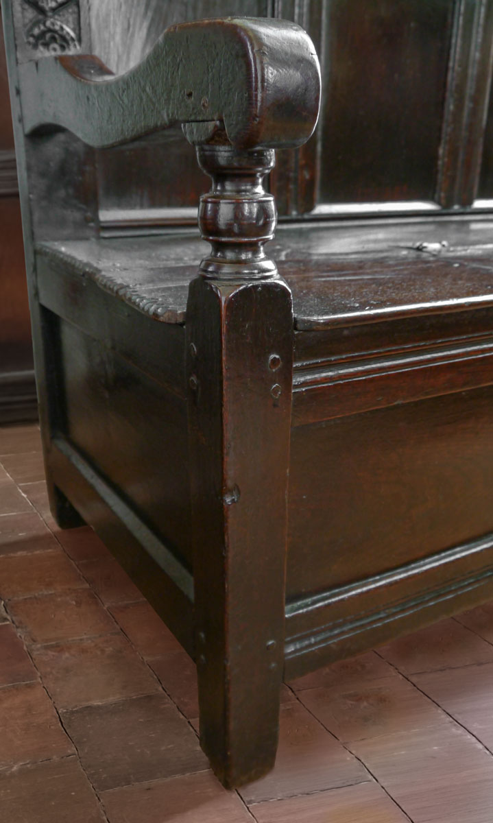 Above the boarded lifting seat – which retains the original iron butterfly hinges – are five plain panels, set into a run moulded frame. Below the seat are four rectangular panels, again in a run-moulded frame.