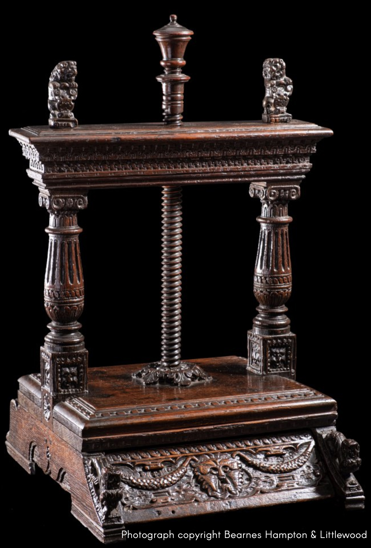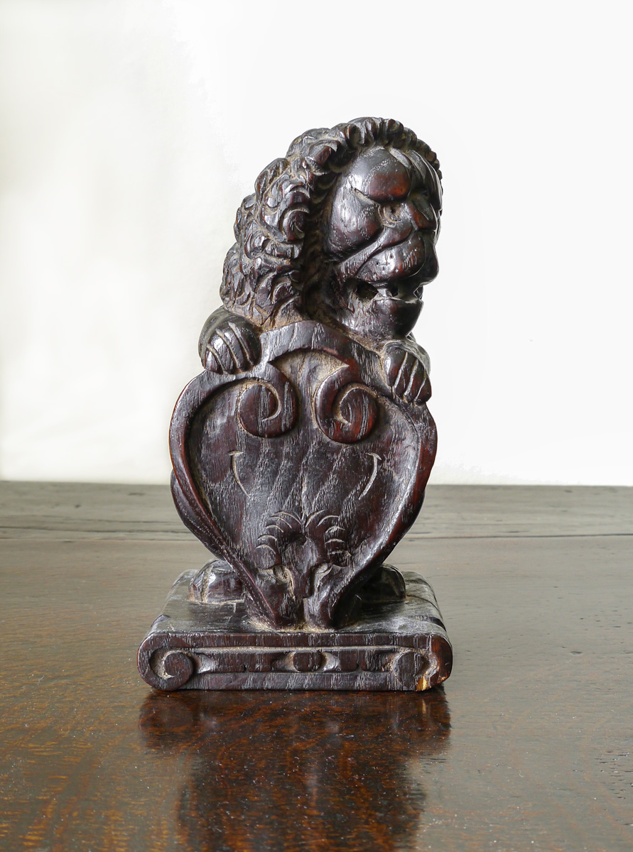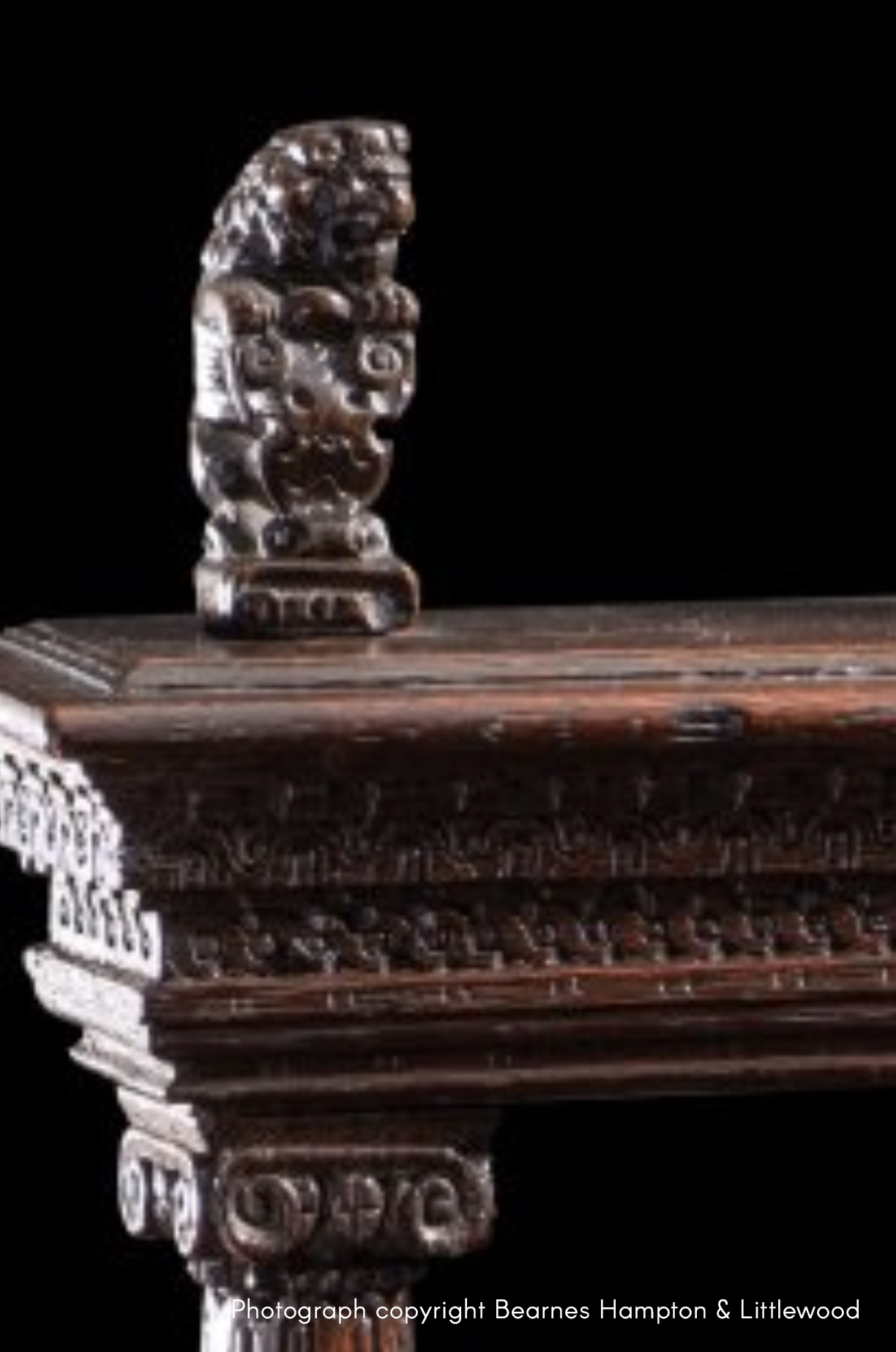 I don’t think this little chap would have sat atop of a staircase newel post, but rather have been the decoration for a piece of Elizabethan furniture, such as is pictured in the book press below, which was sold in the Butler Collection, March 2020, at Bearne’s in Exeter.