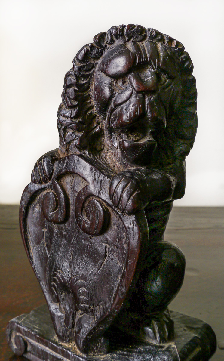 Small but perfectly formed, the carved figure has a fantastically detailed face, beneath the most amazingly carved mane, the detail of which I have never seen before – intricate interlacing whorls. The lion’s paws rest on a shield, upon which bears a small stylised flower head at the bottom – probably a merchant’s mark. Behind the shield, the lion’s ribs, knees and rear paws are all carved, again in good detail, and curving round the lion’s body is a tail finishing in a little tassel.