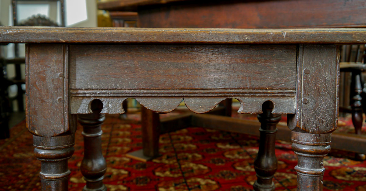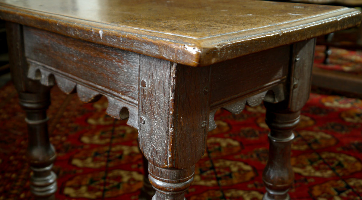 The top, with a fine double-moulded edge, above intricately moulded and shaped rails. The legs are elaborately and skillfully turned, with a “reeded” edge on all the square outside horizontal edges, whilst the internal corners have a deep chamfer.