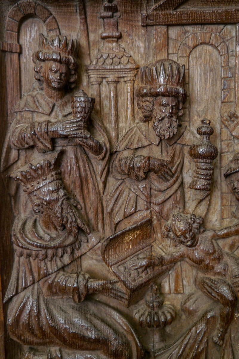 The panels are carved in the most exquisite detail, by a very highly accomplished craftsman. The clothes, faces, beards and backgrounds are all perfectly executed.
