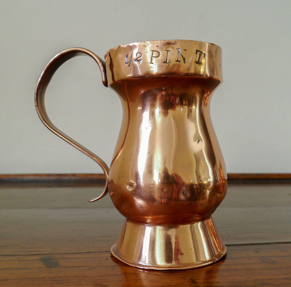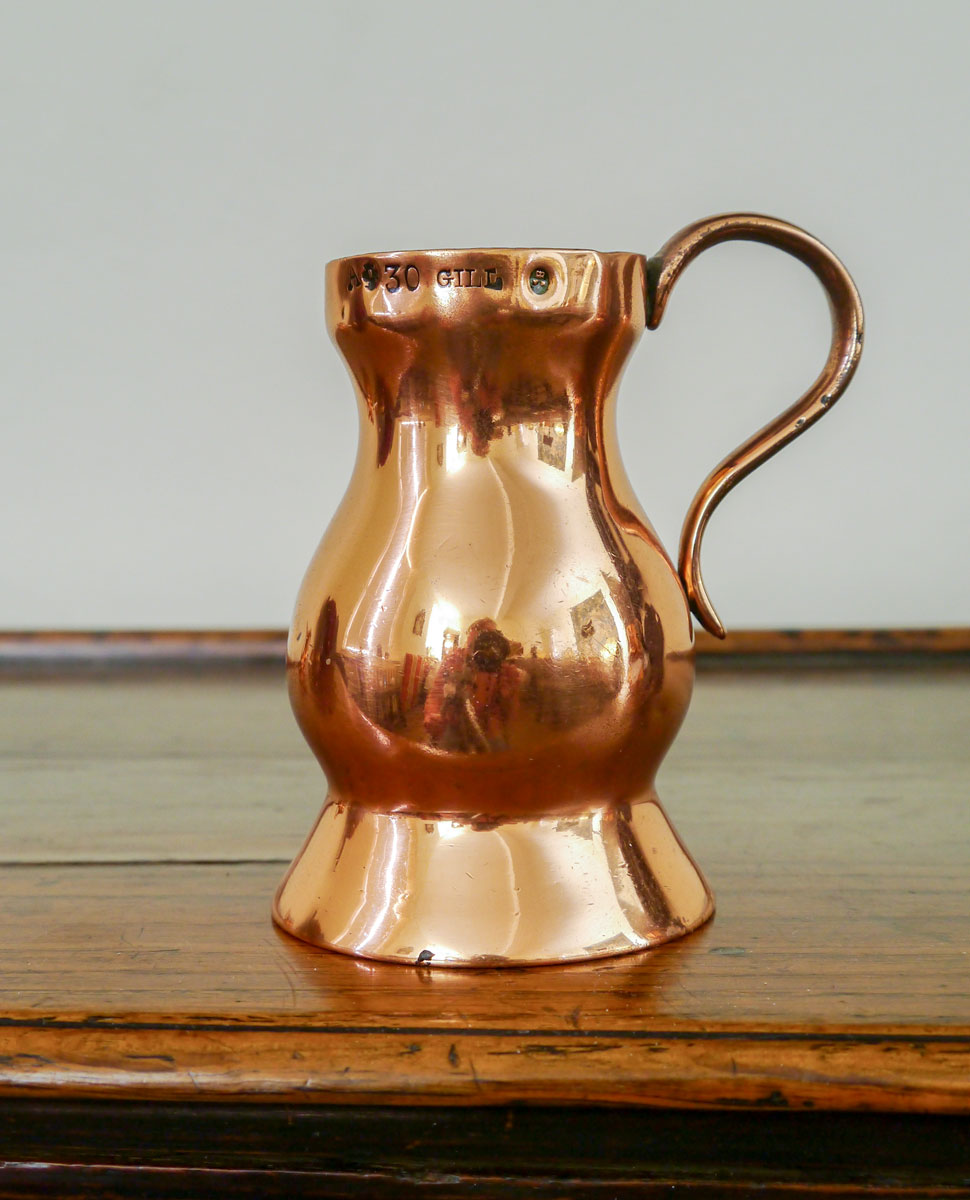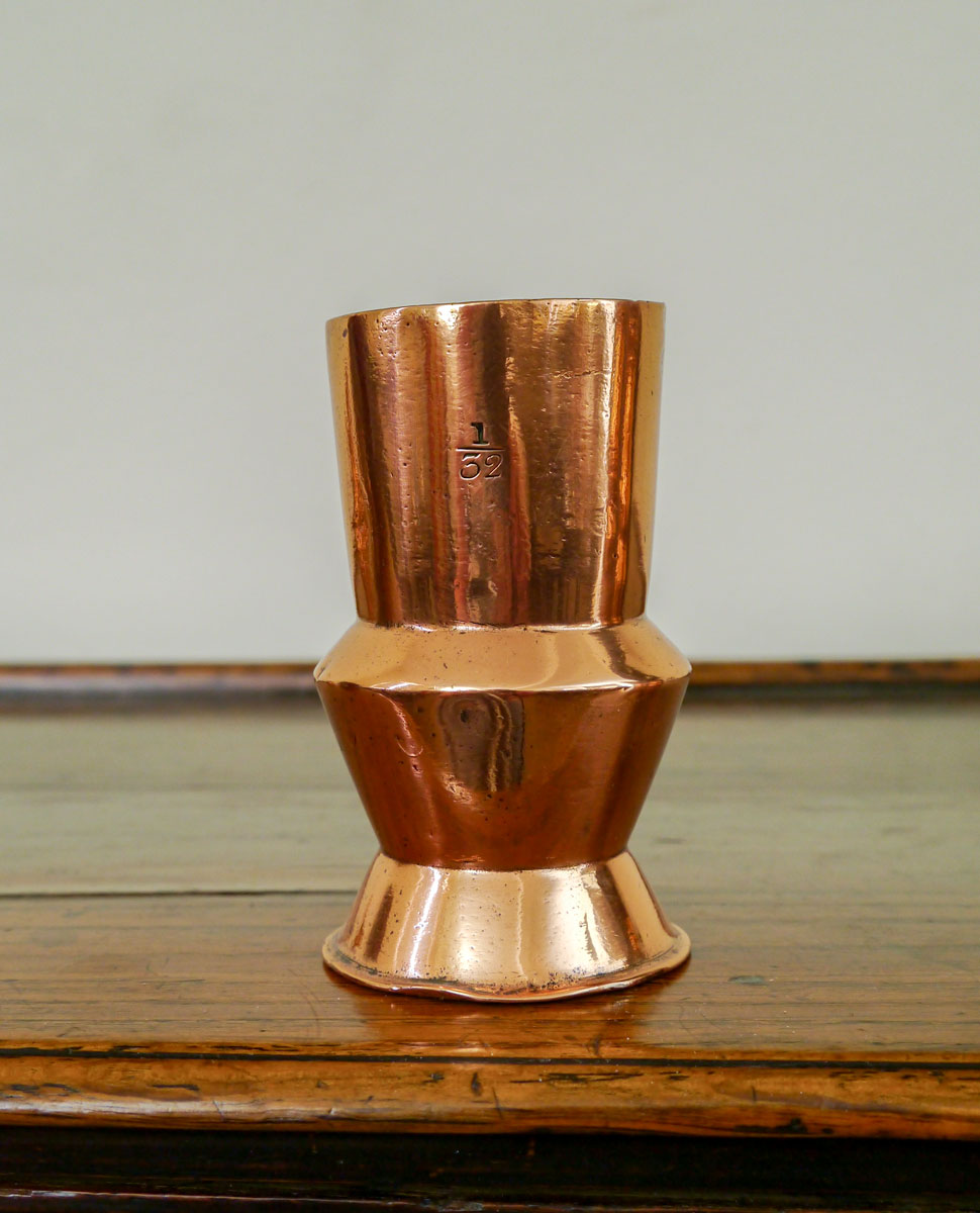 Two of bellied form – one stamped for half a pint, one stamped for a gill. Together with a thistle measure clearly stamped 1/32.